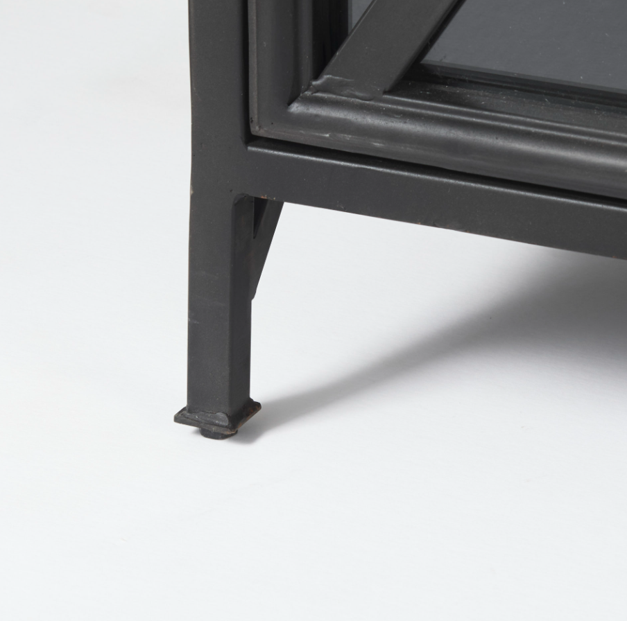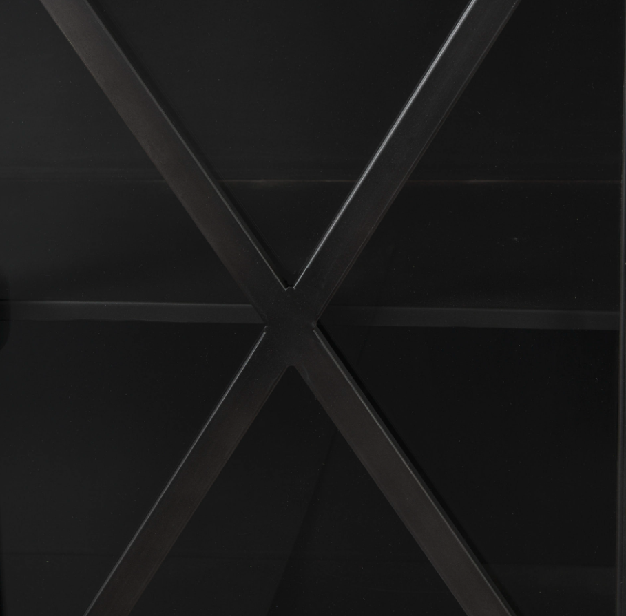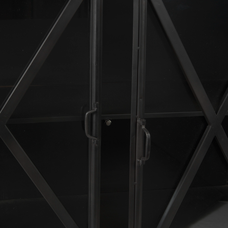 Ce buffet possède quatre portes métalliques avec inserts en verre et un motif à croisillons métalliques, lui conférant un style industriel. L'étagère métallique fixe offre un espace de rangement généreux pour tous vos essentiels d'entrée, de salon ou de salle à manger. Sa transparence apporte une touche d'élégance.