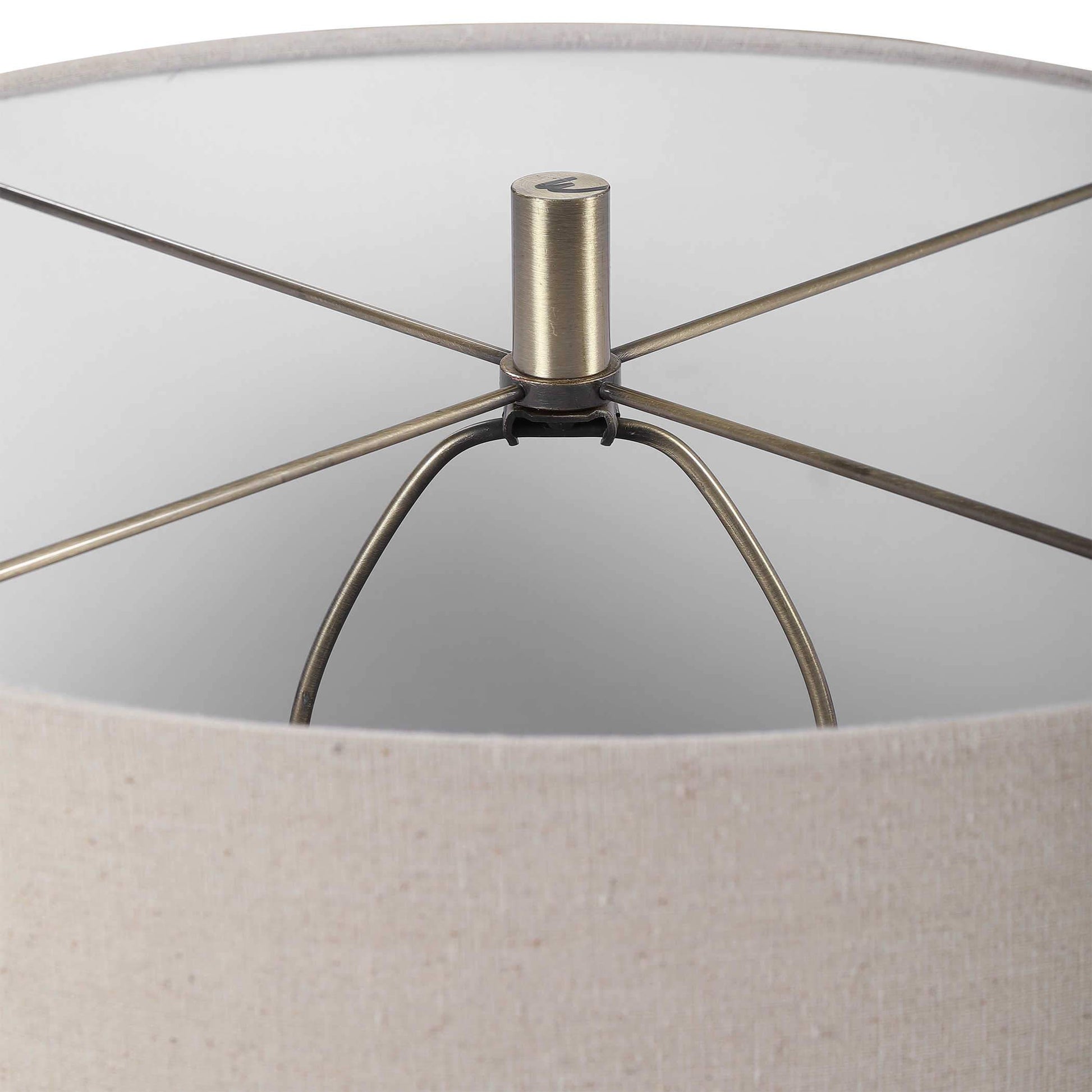 La lampe de table Prospect présente un motif à rayures naturelles évoquant les formations de grès. Elle est mise en valeur par un abat-jour en lin beige et des détails en laiton.