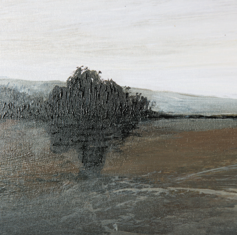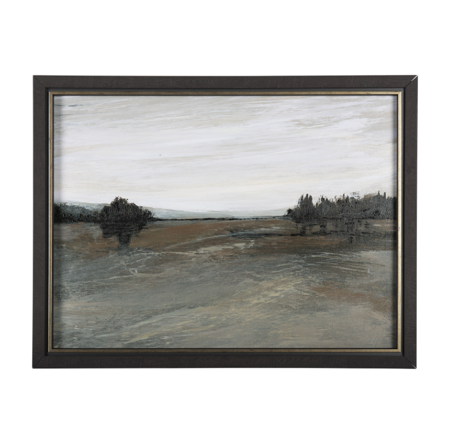 Cette œuvre, inspirée de la peinture à l'huile traditionnelle, représente un paysage abstrait aux teintes sombres et mystérieuses. Elle est encadrée d'un cadre foncé qui la met en valeur.