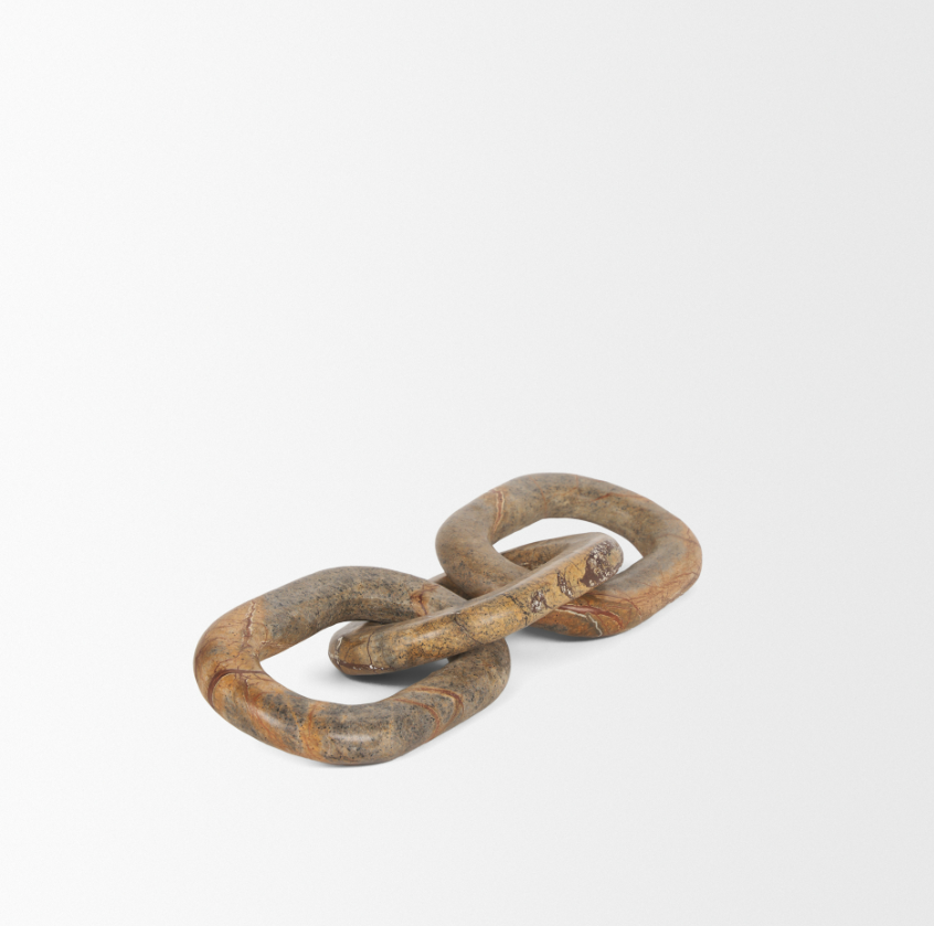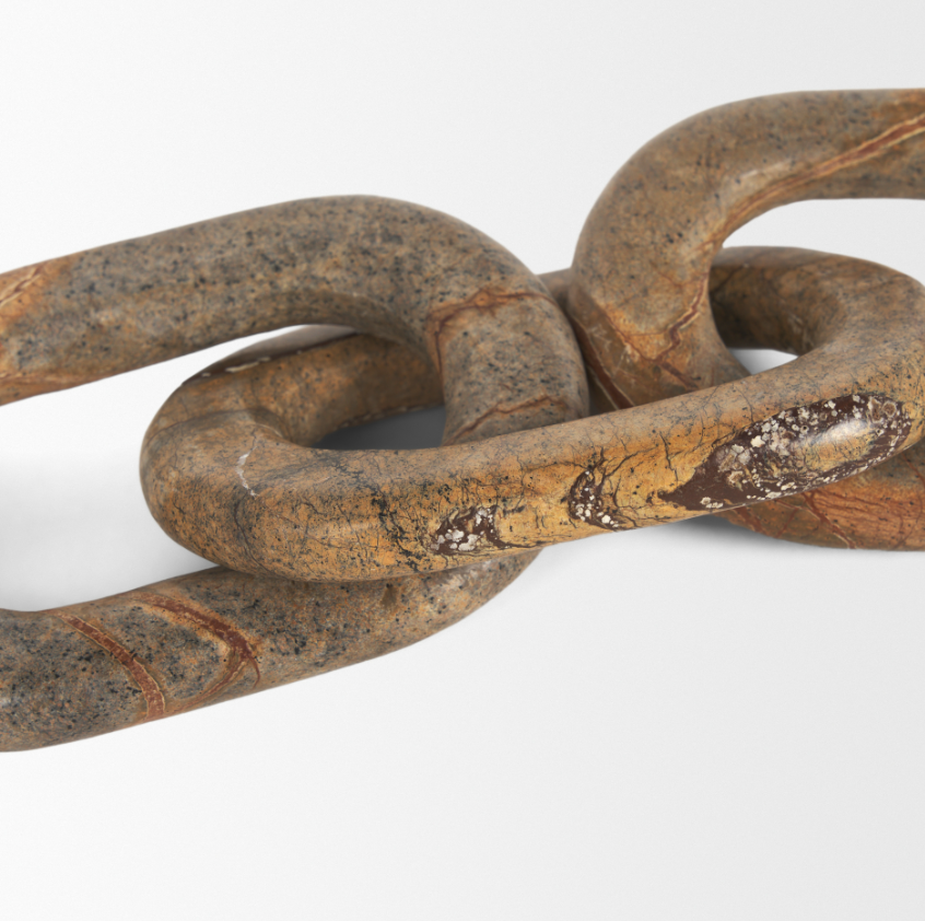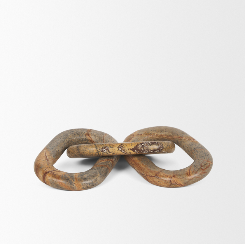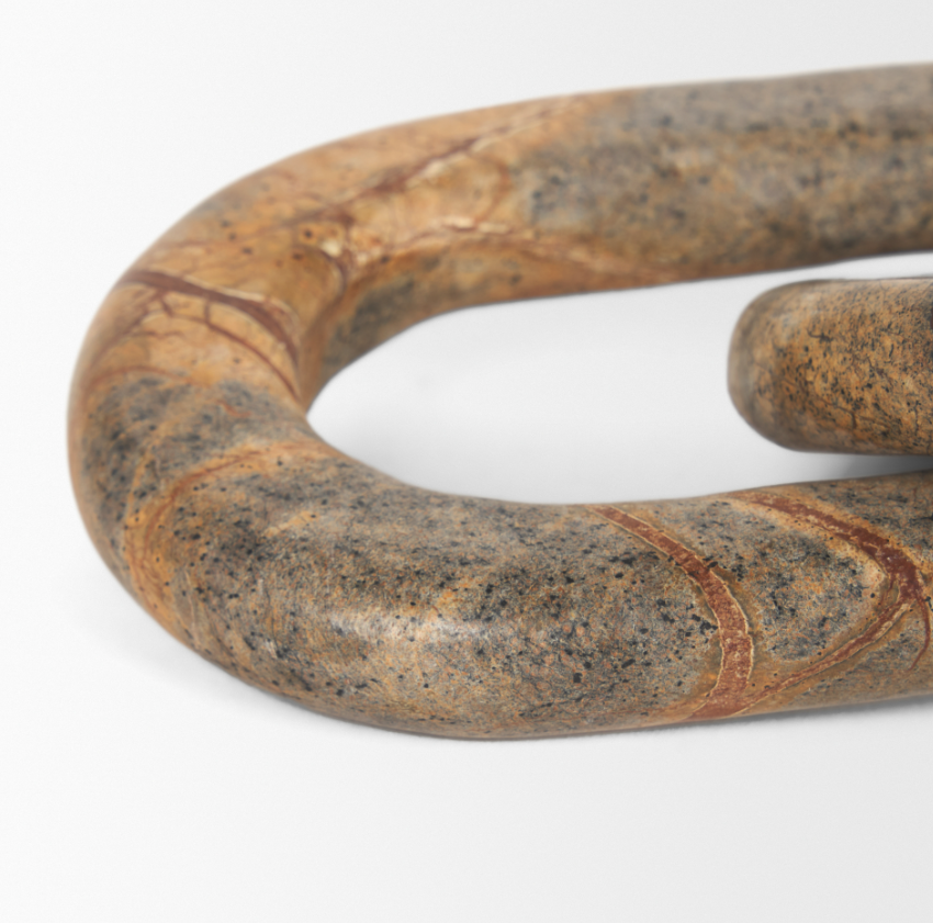 Sculpté dans un marbre exceptionnel aux nuances de rouge-brun, de gris et de beige qui s'entrelacent en divers motifs, cet objet décoratif en forme de maillons de chaîne est un véritable bijou. Cet accessoire en marbre massif et imposant apportera une touche d'élégance et de raffinement à n'importe quelle surface.