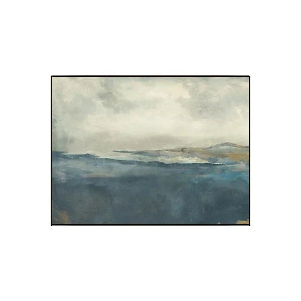 La sérénité incarnée. Cette toile grand format présente des lavis de bleu apaisants. Des touches de tons chauds et terreux en font un complément idéal pour des meubles en bois clair et des rideaux aux tons neutres.