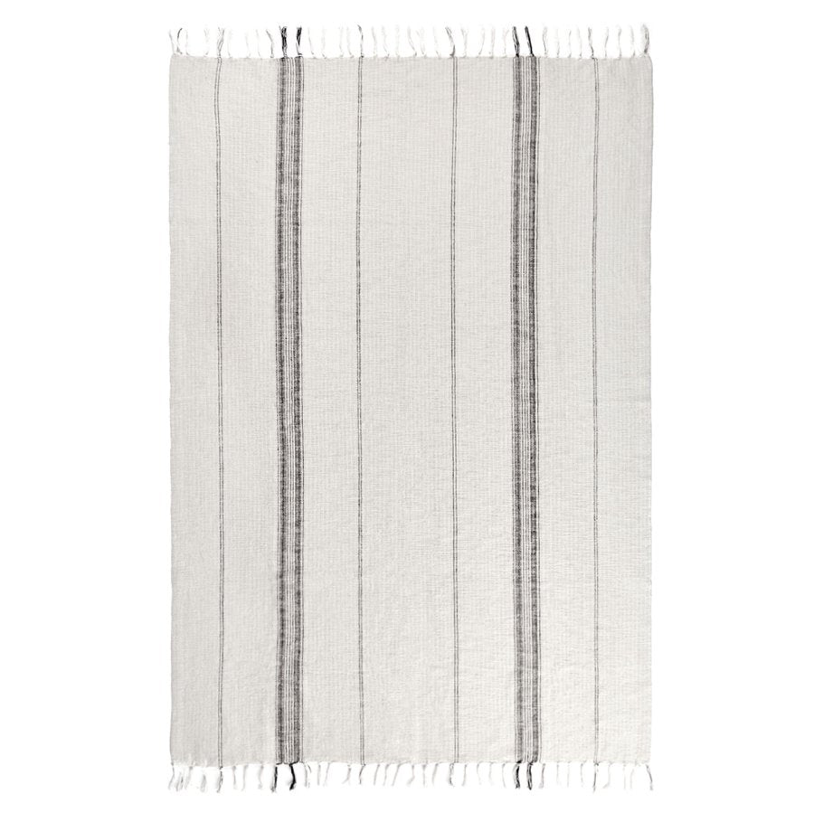 Le plaid Ria présente un élégant motif à rayures tissées et deux franges nouées à la main, pour une texture agréable et un toucher doux. Deux coloris sont disponibles : Naturel/Noir ou Ivoire/Gris.
