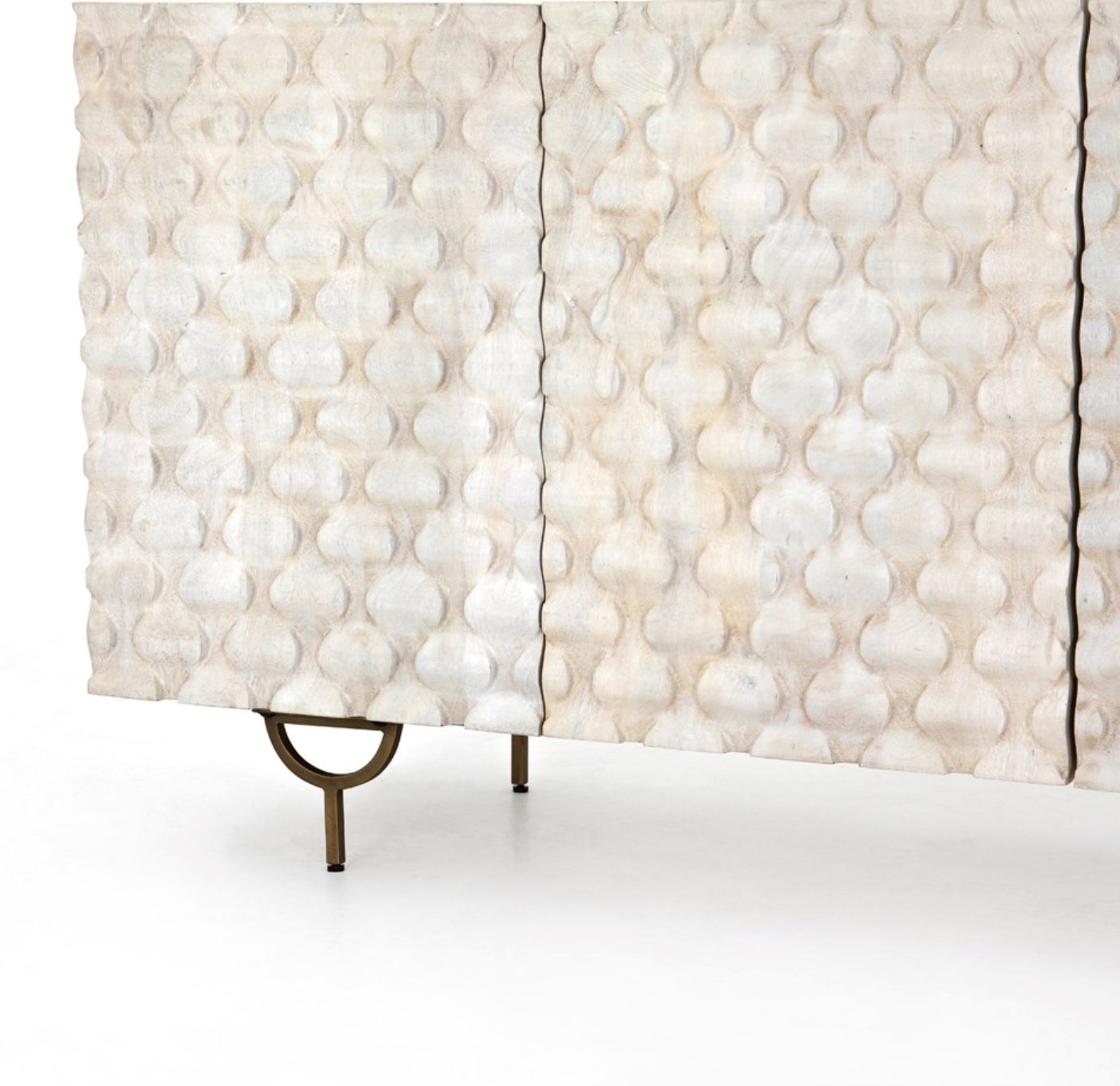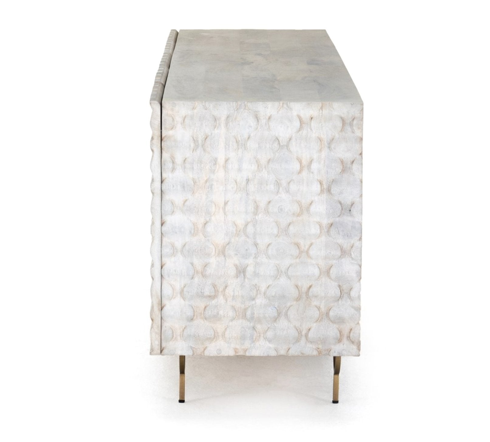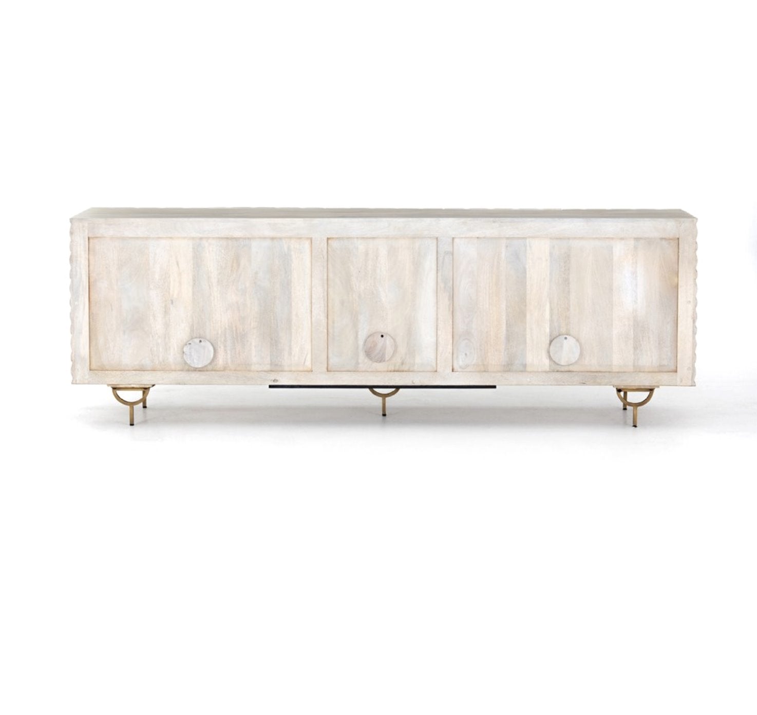 Des sculptures complexes en bois de manguier blanchi à la chaux et des pieds arrondis en fer et laiton apportent une texture unique et une touche de modernité, tandis que les étagères intérieures offrent un espace de rangement généreux pour les appareils multimédias.