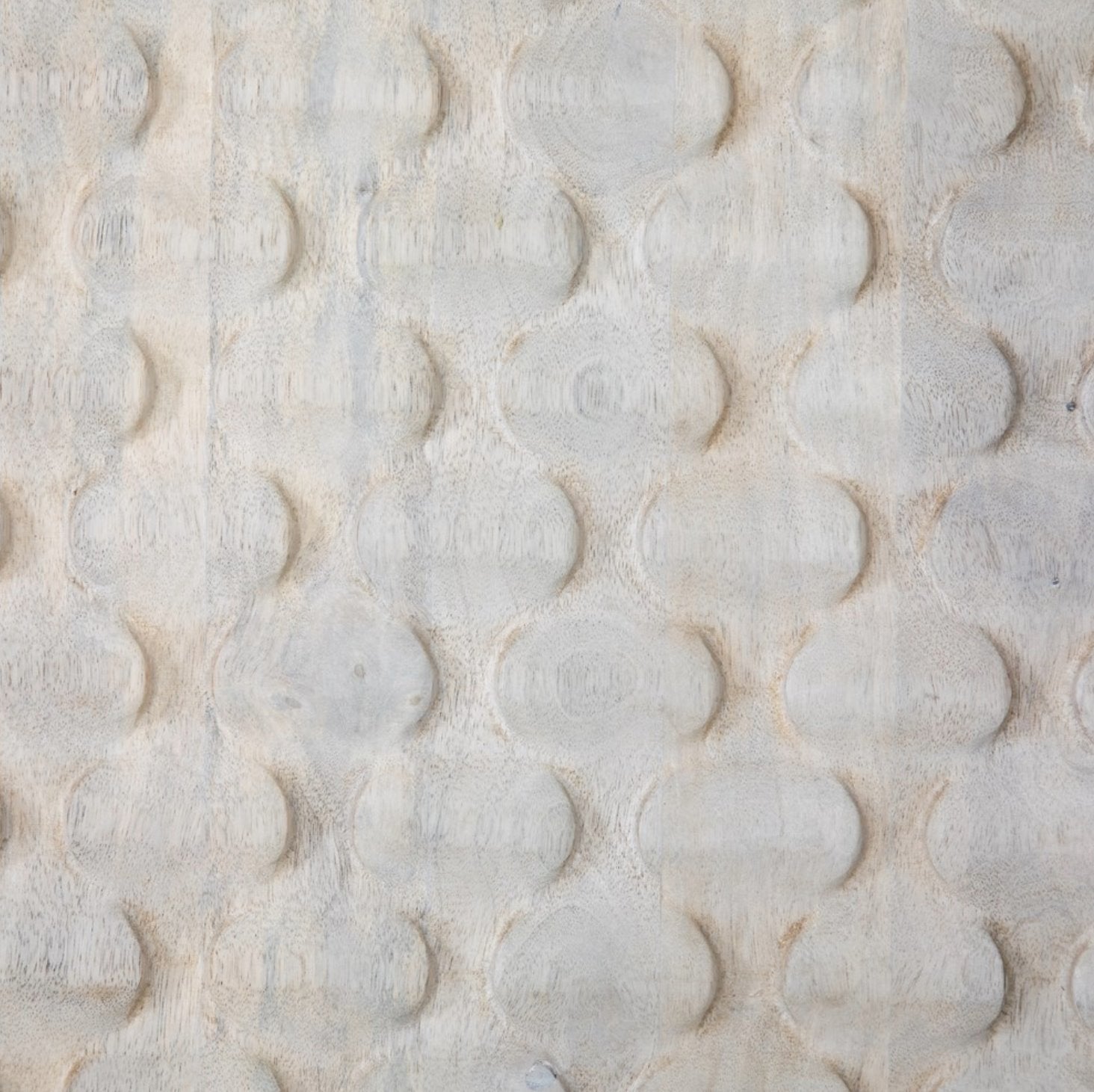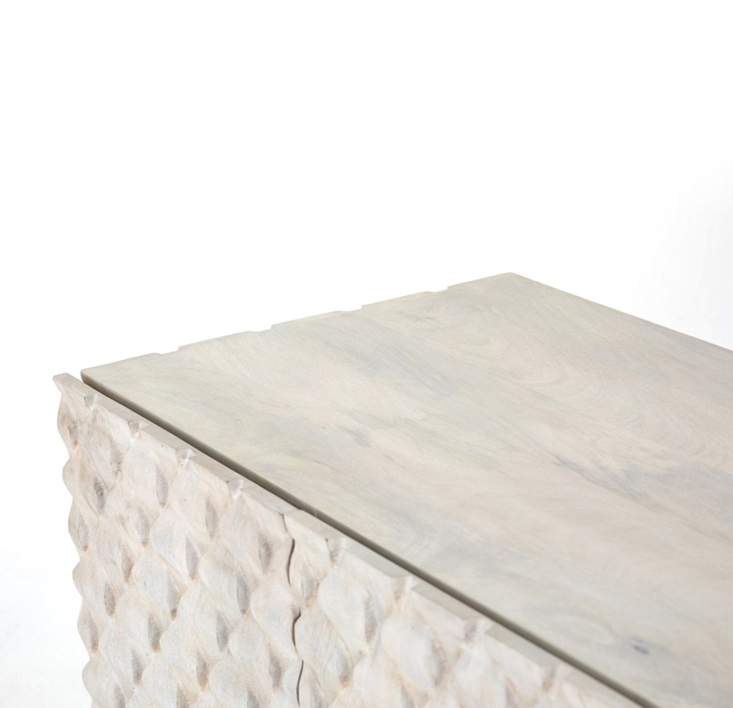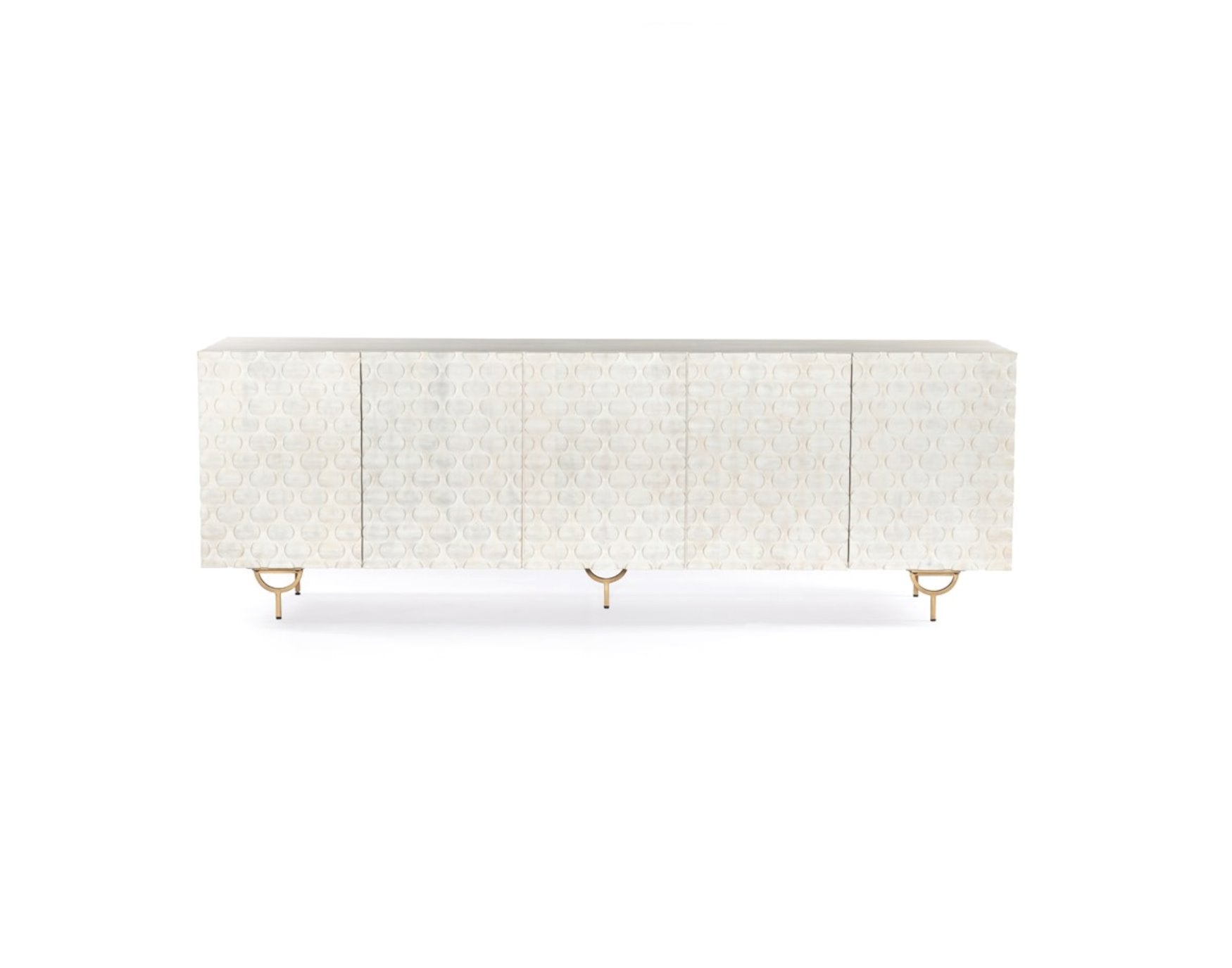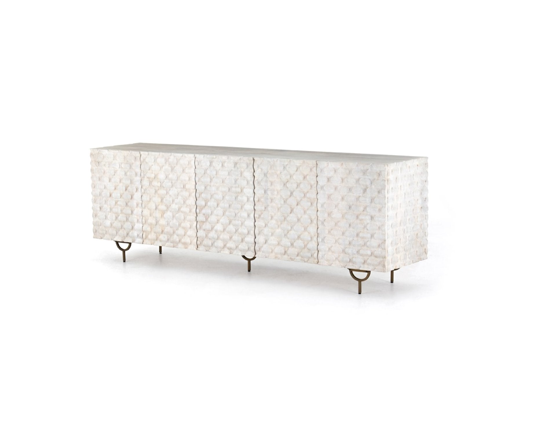Des sculptures complexes en bois de manguier blanchi à la chaux et des pieds arrondis en fer et laiton apportent une texture unique et une touche de modernité, tandis que les étagères intérieures offrent un espace de rangement généreux pour les appareils multimédias.