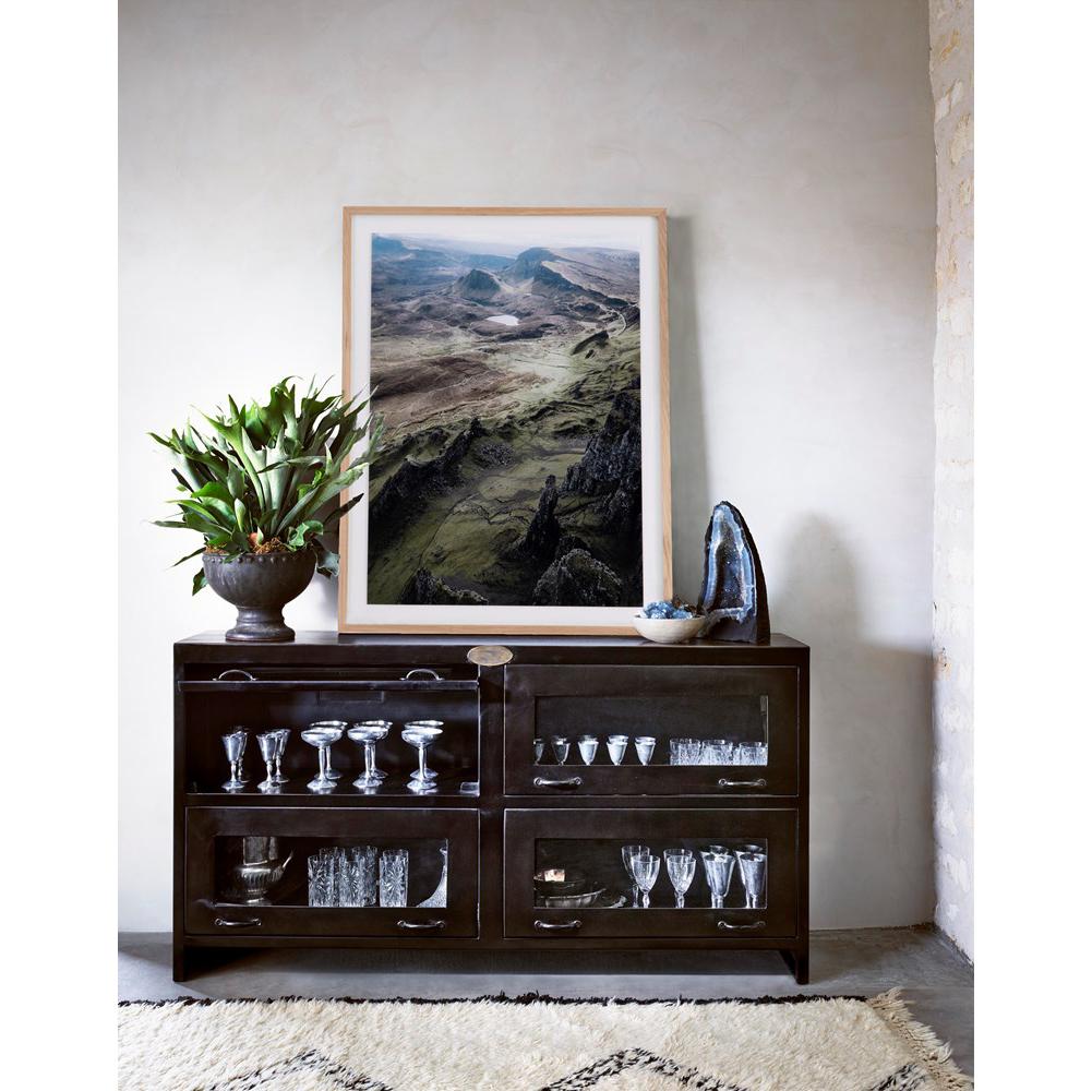 Inspirée des meubles d'atelier d'antan, une console fine en fer vieilli est dotée d'un plateau en bois de manguier patiné et de portes vitrées relevables, idéale pour ranger des appareils multimédias modernes dans le salon ou pour exposer des articles de bar et de service dans la salle à manger.