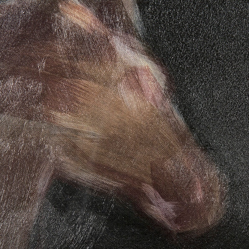 Cette œuvre grand format représente des chevaux au galop sur fond noir. Les couleurs neutres et la délicatesse du travail au pinceau confèrent à l'ensemble une impression de mouvement fluide. Un passe-partout couleur crème et un cadre en bois rustique complètent la composition.
