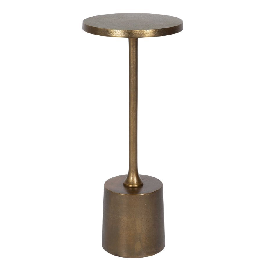 Une table basse sophistiquée, fabriquée en aluminium massif et conçue dans un style minimaliste avec un piètement épais et une finition texturée or antique.