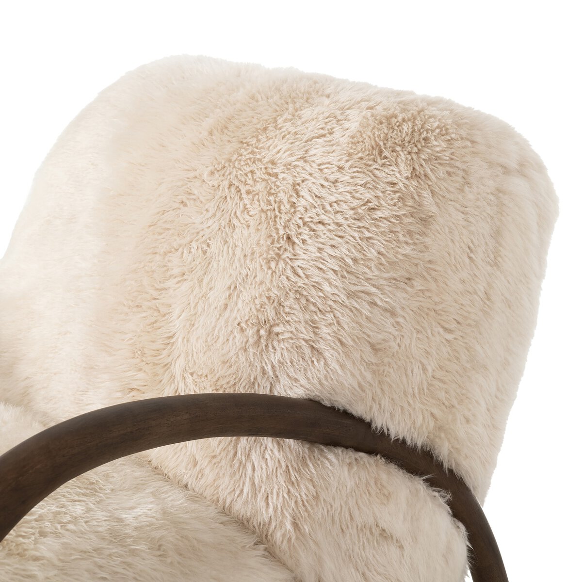Ce fauteuil d'appoint polyvalent est revêtu d'un tissu imitation peau de mouton mongole à poils longs et texturés. Une structure robuste en bois d'hévéa, brossée pour une touche chaleureuse et vintage, épouse l'assise.