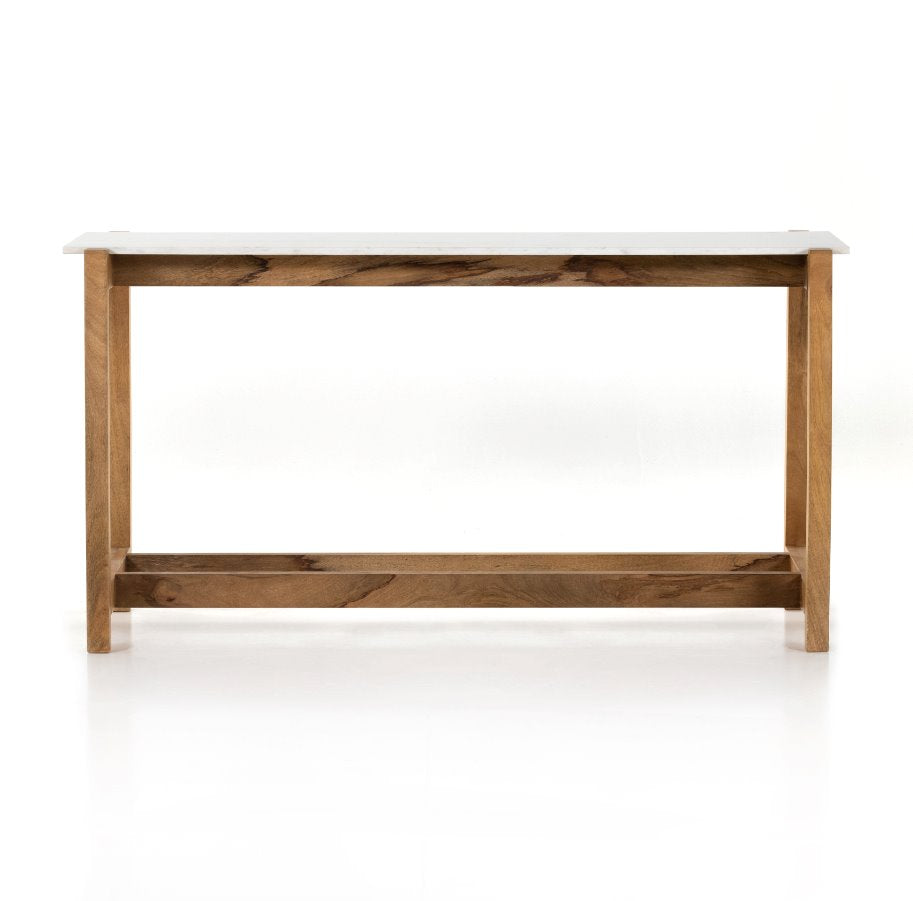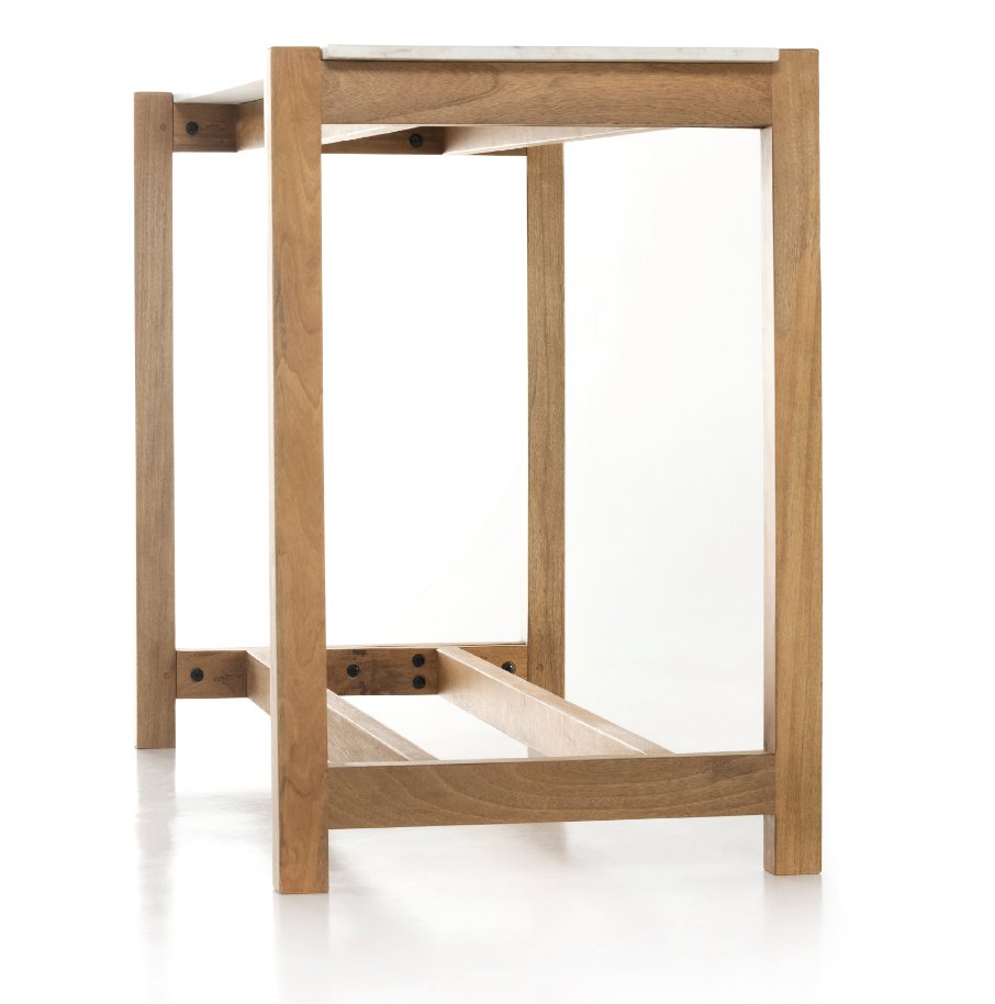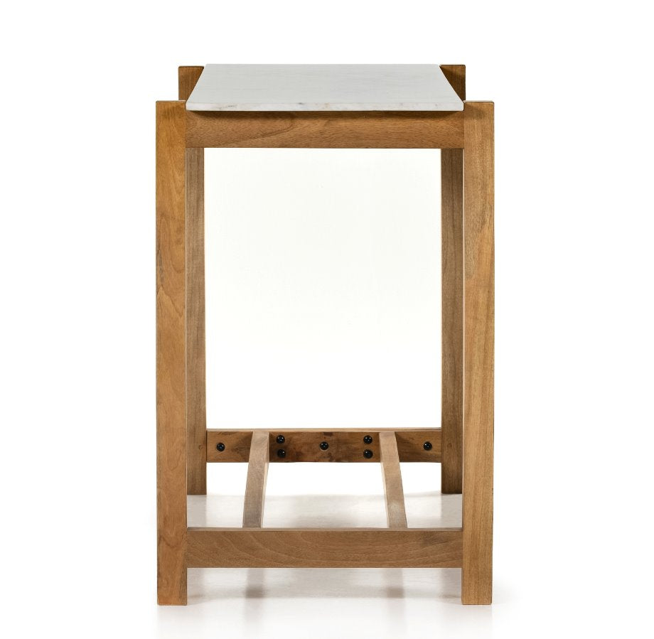 Simple et épurée, cette table de bar moderne se distingue par un mélange de matériaux saisissant. Le manguier à la finition auburn forme une structure ajourée qui soutient un plateau rectangulaire en marbre blanc massif, insufflant une touche mid-century au style traditionnel des fermes.