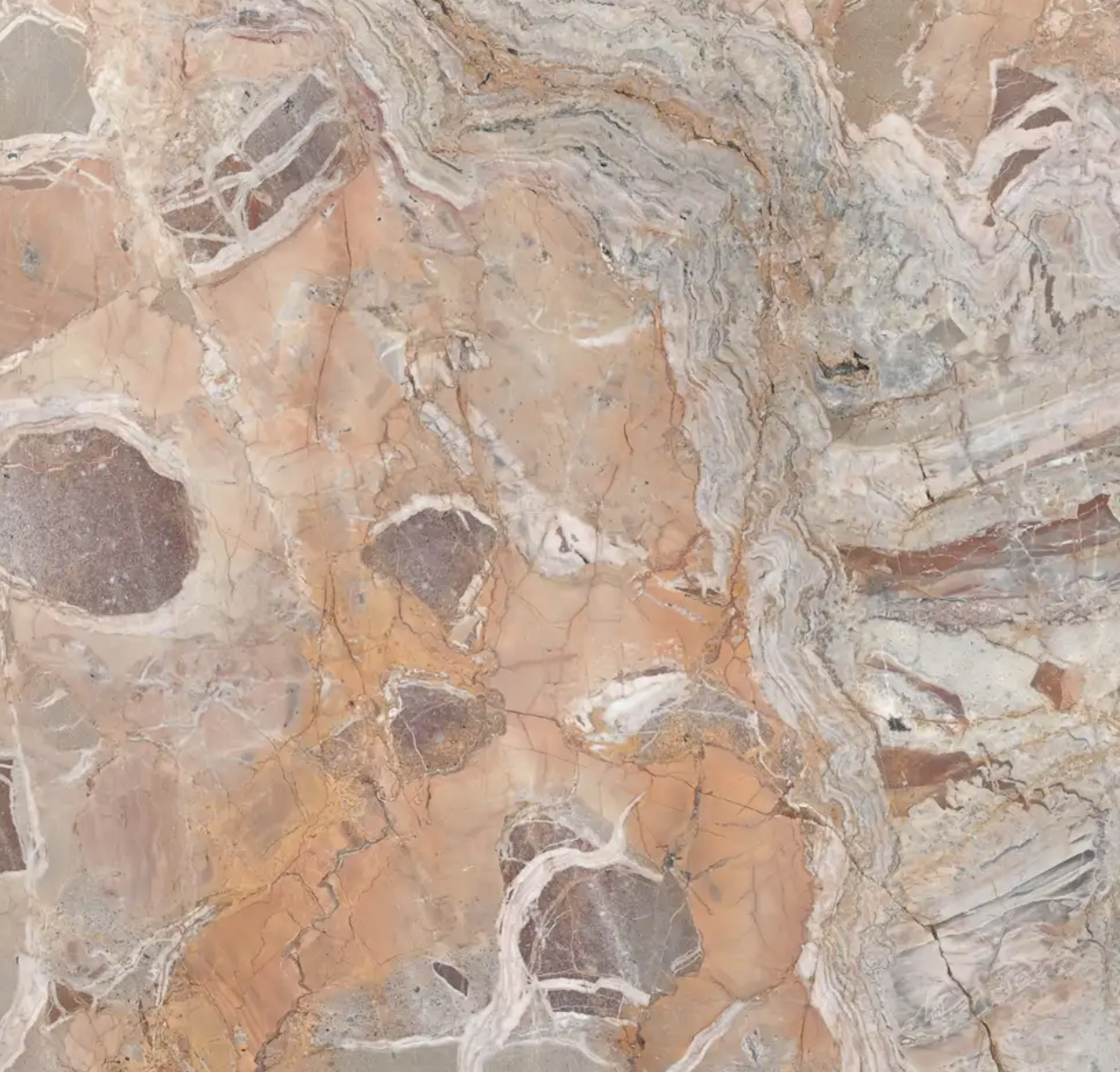 Le marbre, d'une beauté saisissante, se déploie avec grâce sur la surface du motif. Son marbre orange lavante massif crée des bords doux et lisses, tandis que la base segmentée présente une découpe angulaire à partir d'une forme arrondie.