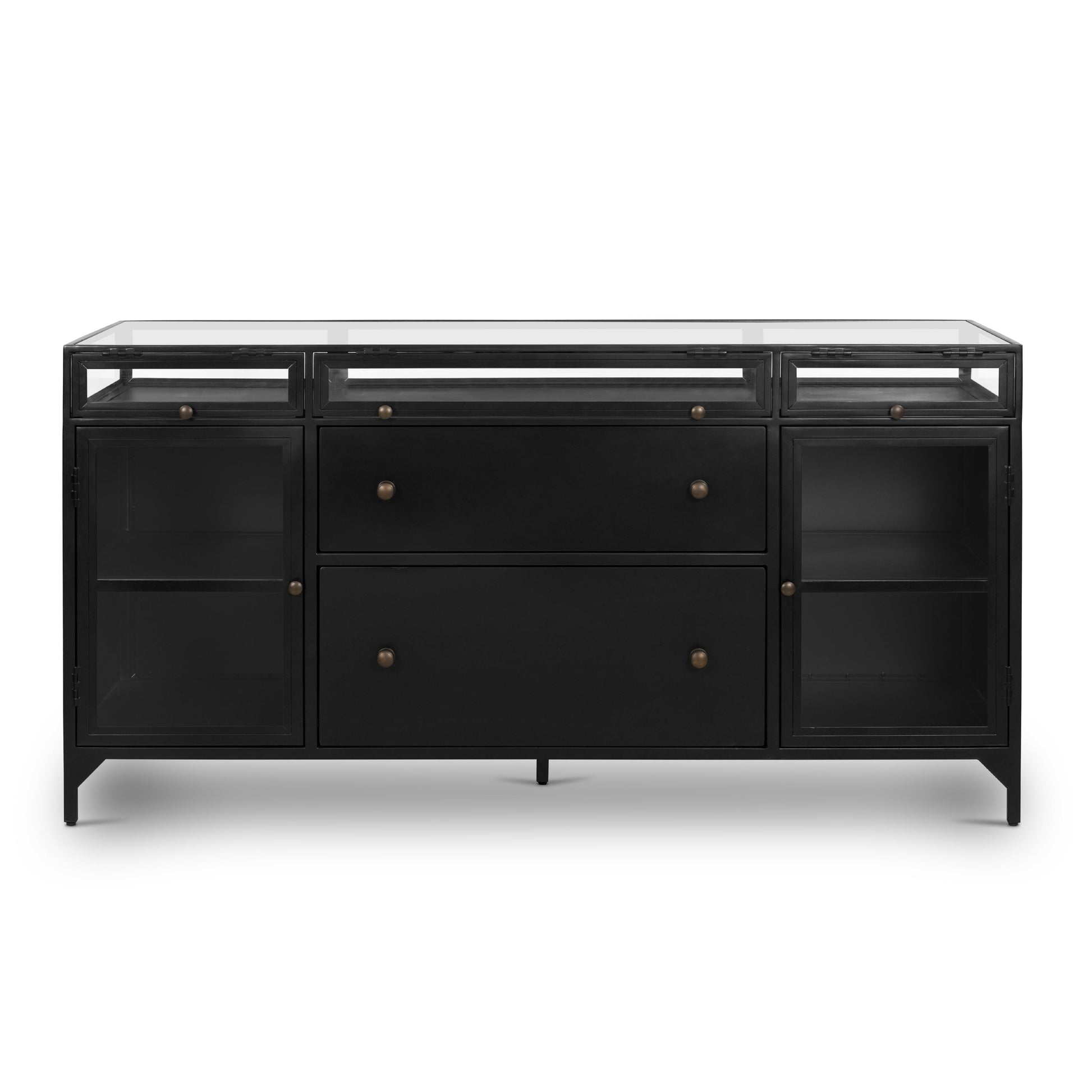 Un meuble de rangement de style vitrine allie travail et loisirs. Exposez vos objets précieux dans une vitrine en verre aux poignées en métal noir mat et laiton. De spacieux tiroirs permettent un rangement pratique des documents aux formats légal et lettre, tandis que des placards latéraux offrent un espace de rangement supplémentaire. Possibilité d'associer le meuble au bureau assorti.