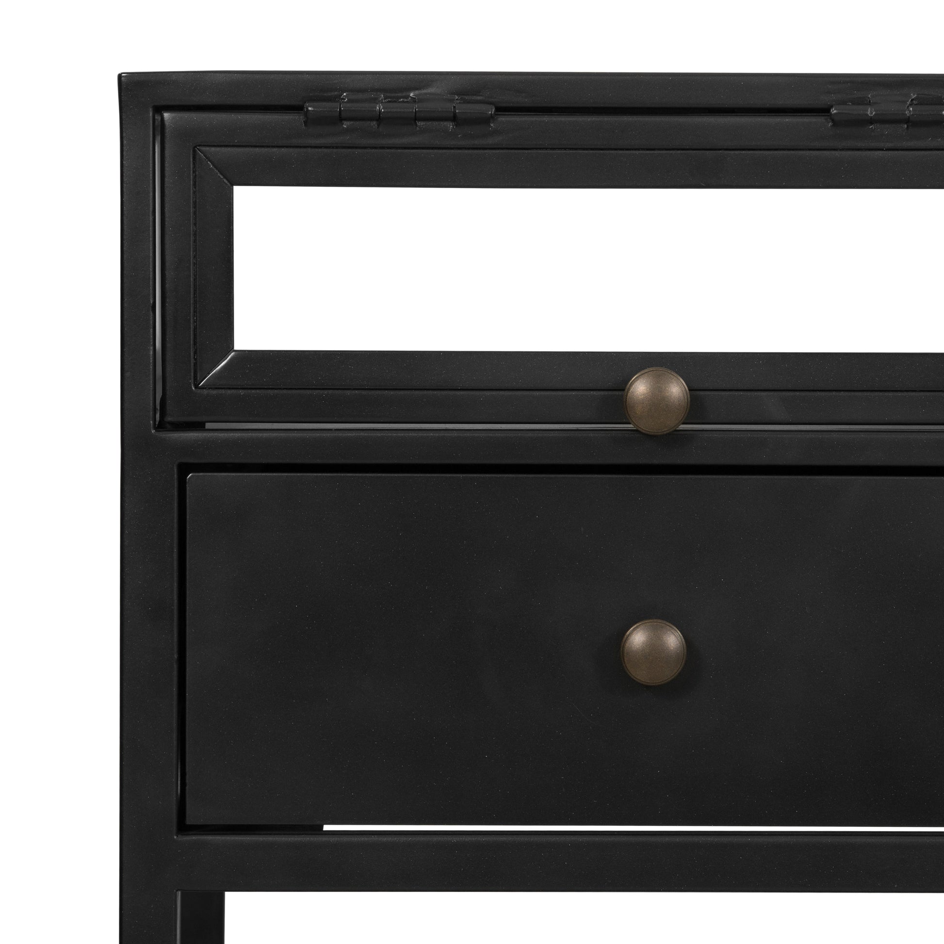 Un bureau de style vitrine allie travail et détente. Fabriqué en fer noir avec des poignées en bronze, il est doté de vitrines en verre transparent permettant d'exposer ses objets précieux. Possibilité de l'associer à un classeur assorti.