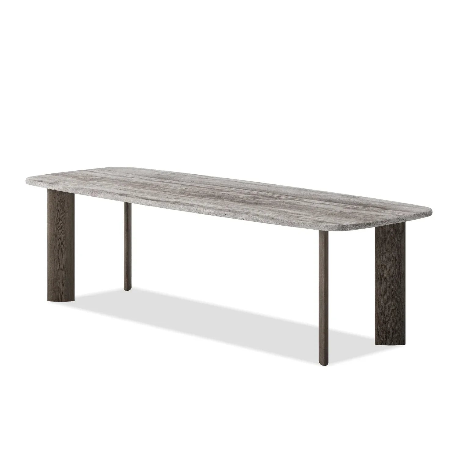 Découvrez la table à manger Shoku, où l'élégance rencontre le design moderne. Son magnifique plateau en marbre travertin gris argenté sublime avec élégance tout espace repas. Ses bords arrondis apportent une touche de douceur et créent une ambiance chaleureuse et intime lors de vos réunions. Fabriqués avec précision, ses pieds en frêne ébène massif sont inclinés pour un style épuré et minimaliste qui met en valeur le luxueux plateau en marbre.
