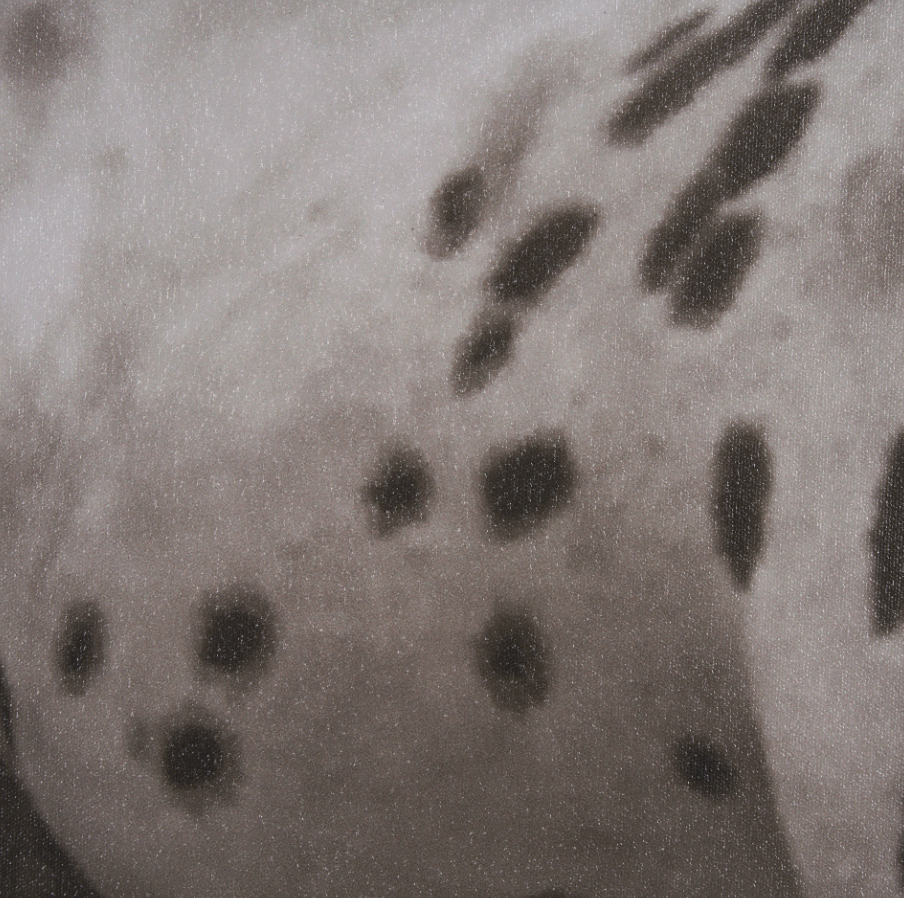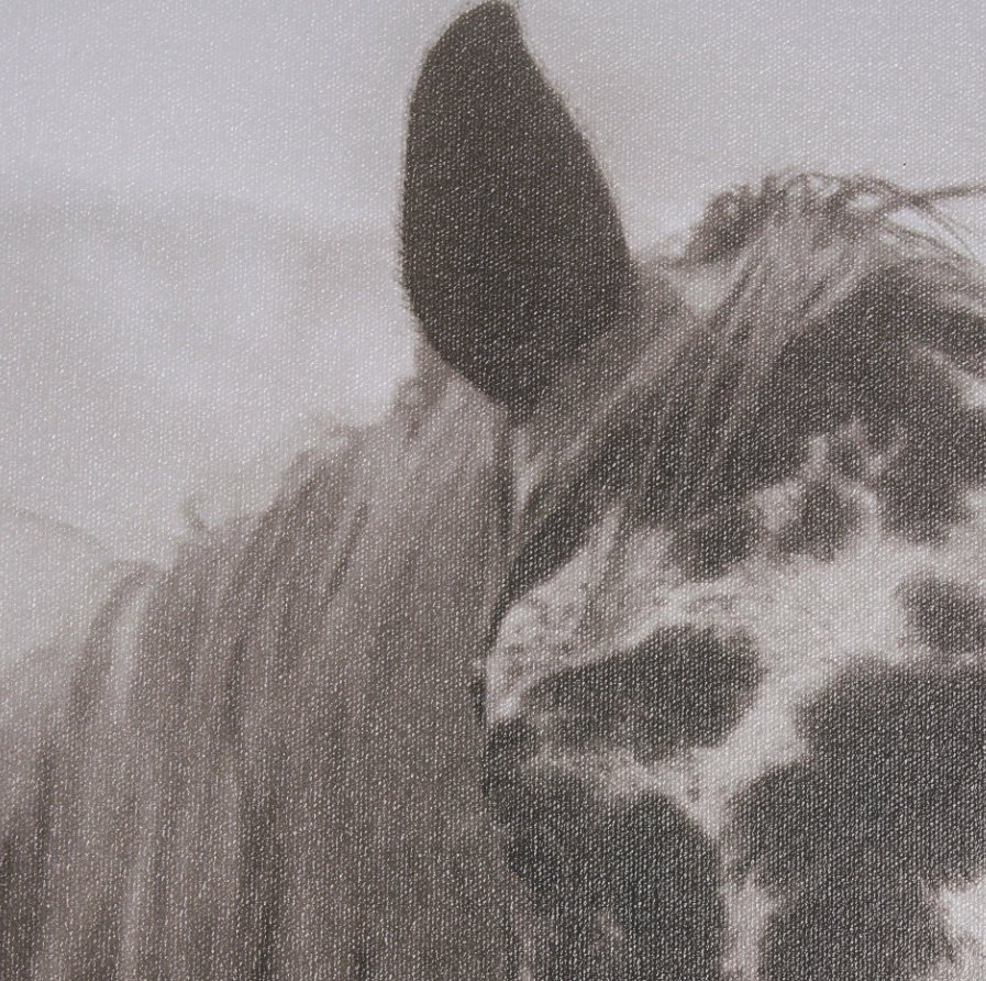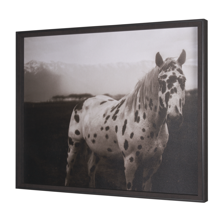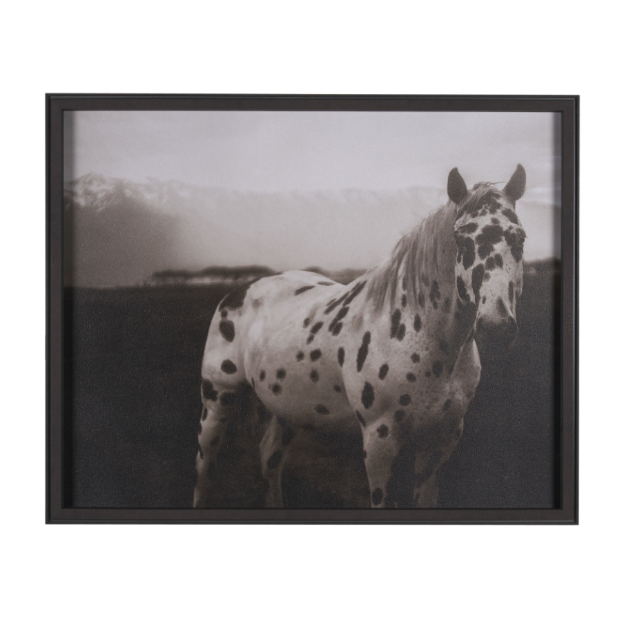 À travers l'objectif du photographe Nathan Kane, une image saisissante d'un cheval tacheté solitaire est capturée avec un appareil photo ancien. Ce tirage noir et blanc, rehaussé à la main, est encadré dans un cadre fermé pour une présentation élégante et intemporelle.