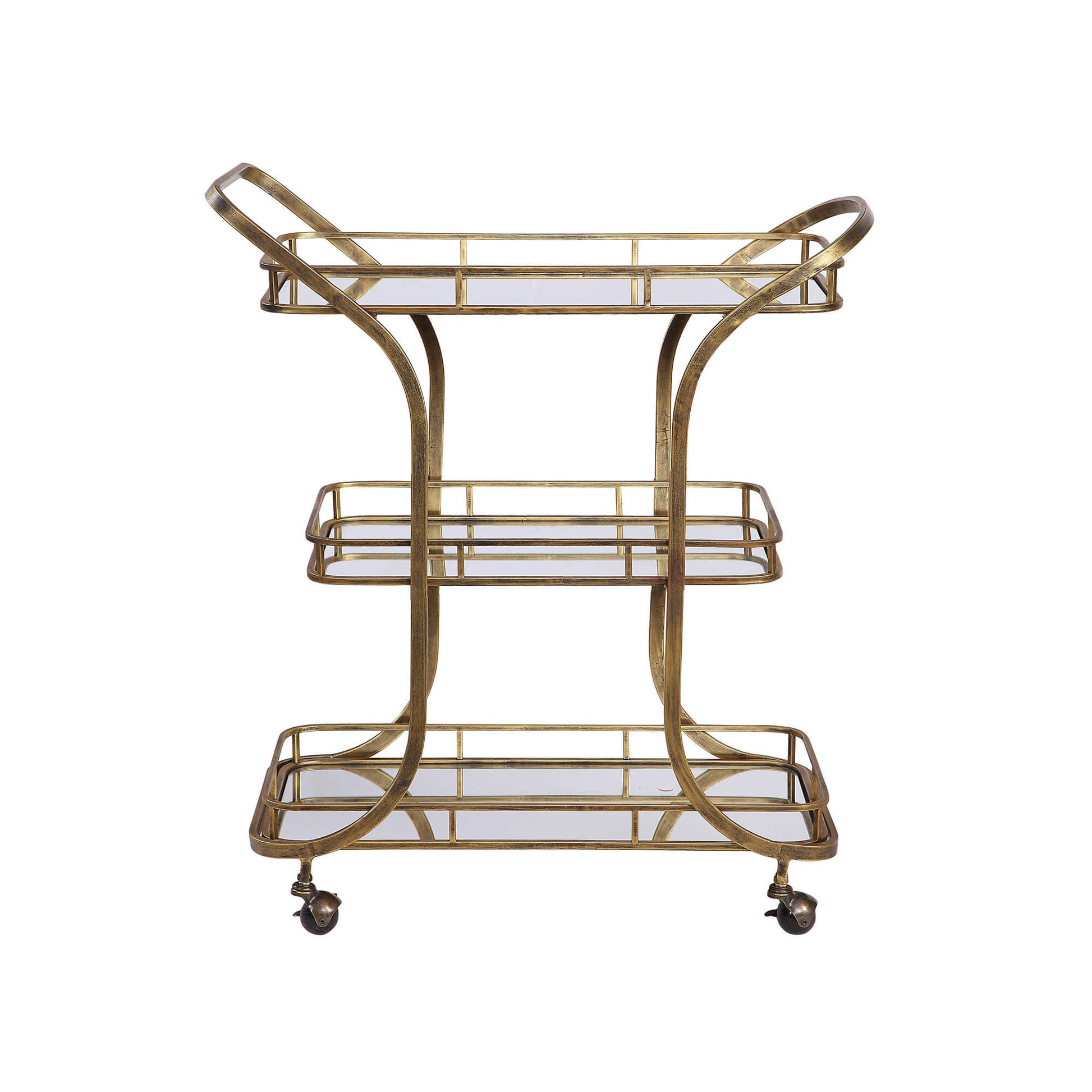 Utilisé comme desserte de bar, comme meuble de rangement supplémentaire dans la cuisine ou pour mettre en valeur de jolis objets, le desserte Stassi est à la fois polyvalente et élégante. Trois étagères en miroir sont intégrées à une structure en fer finition laiton. Ses roulettes facilitent son déplacement, ce qui en fait un atout précieux pour les petits espaces.
