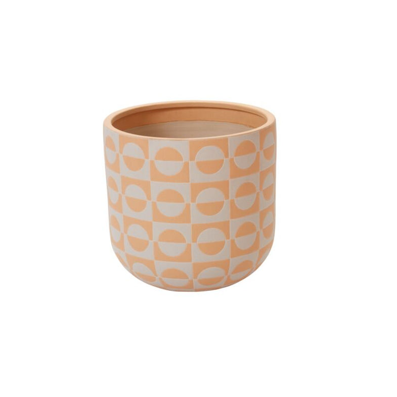 Fabriqué en argile blanche, ce pot étanche est idéal pour les climats tempérés extérieurs. Son motif géométrique texturé jaune et blanc, rappelant des carreaux, apporte une touche de couleur à n'importe quel espace. Nous vous recommandons de rentrer le pot à l'intérieur pendant l'hiver afin de protéger la céramique (et vos plantes !).