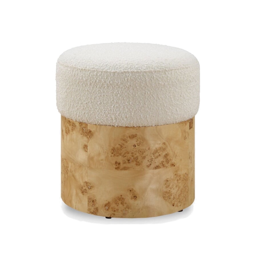Le pouf Swirls allie à la perfection design moderne et éléments naturels. Son piètement est revêtu d'un magnifique placage en loupe de peuplier finition érable. L'assise, en tissu bouclé ivoire texturé, crée une pièce unique et raffinée.