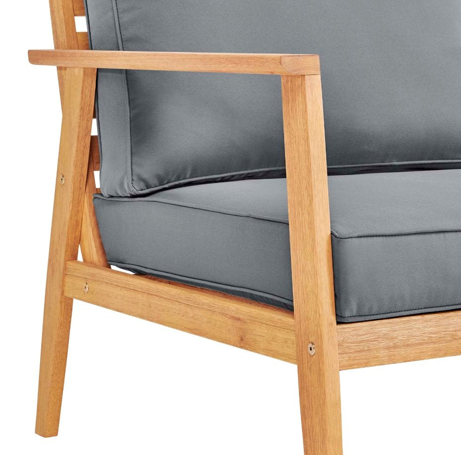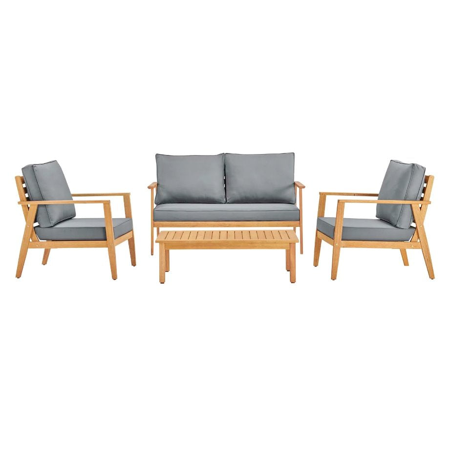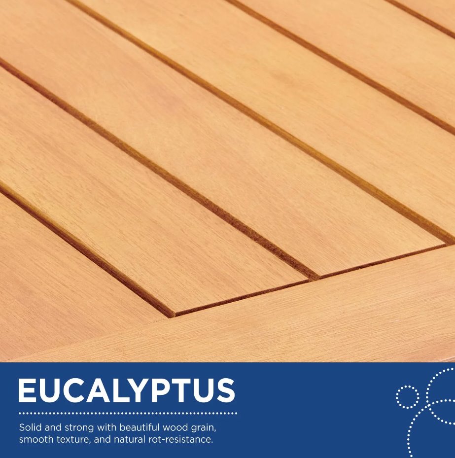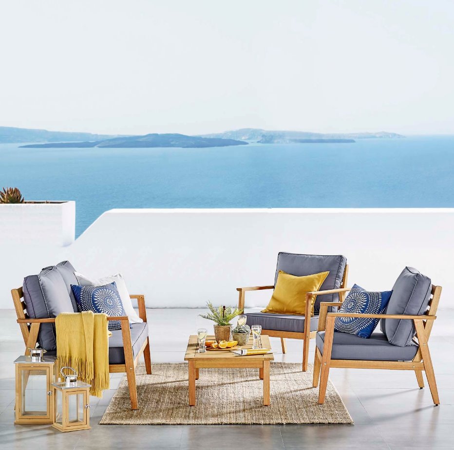 Cet ensemble de patio Syracuse, certifié FSC, comprend deux fauteuils, un canapé deux places avec des coussins rembourrés confortables en tissu résistant aux intempéries, et une table basse de 110 cm de long. Le bois d'eucalyptus à lattes crée une ambiance décontractée et apaisante, idéale pour profiter pleinement du plein air.
