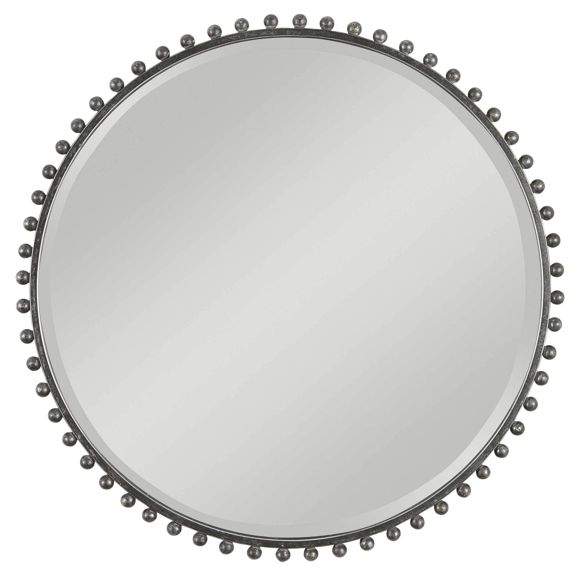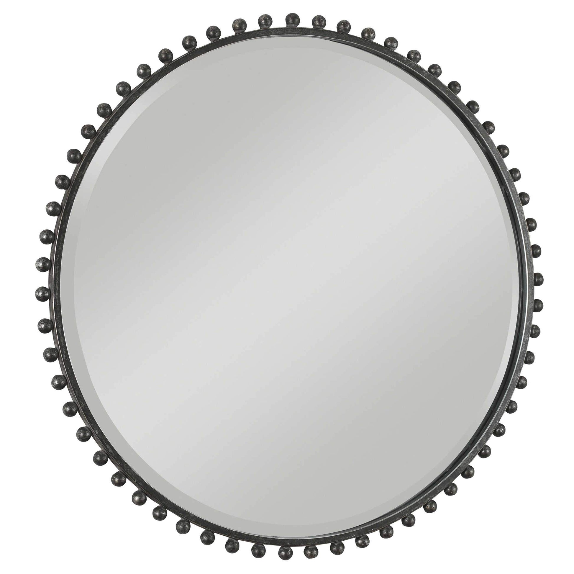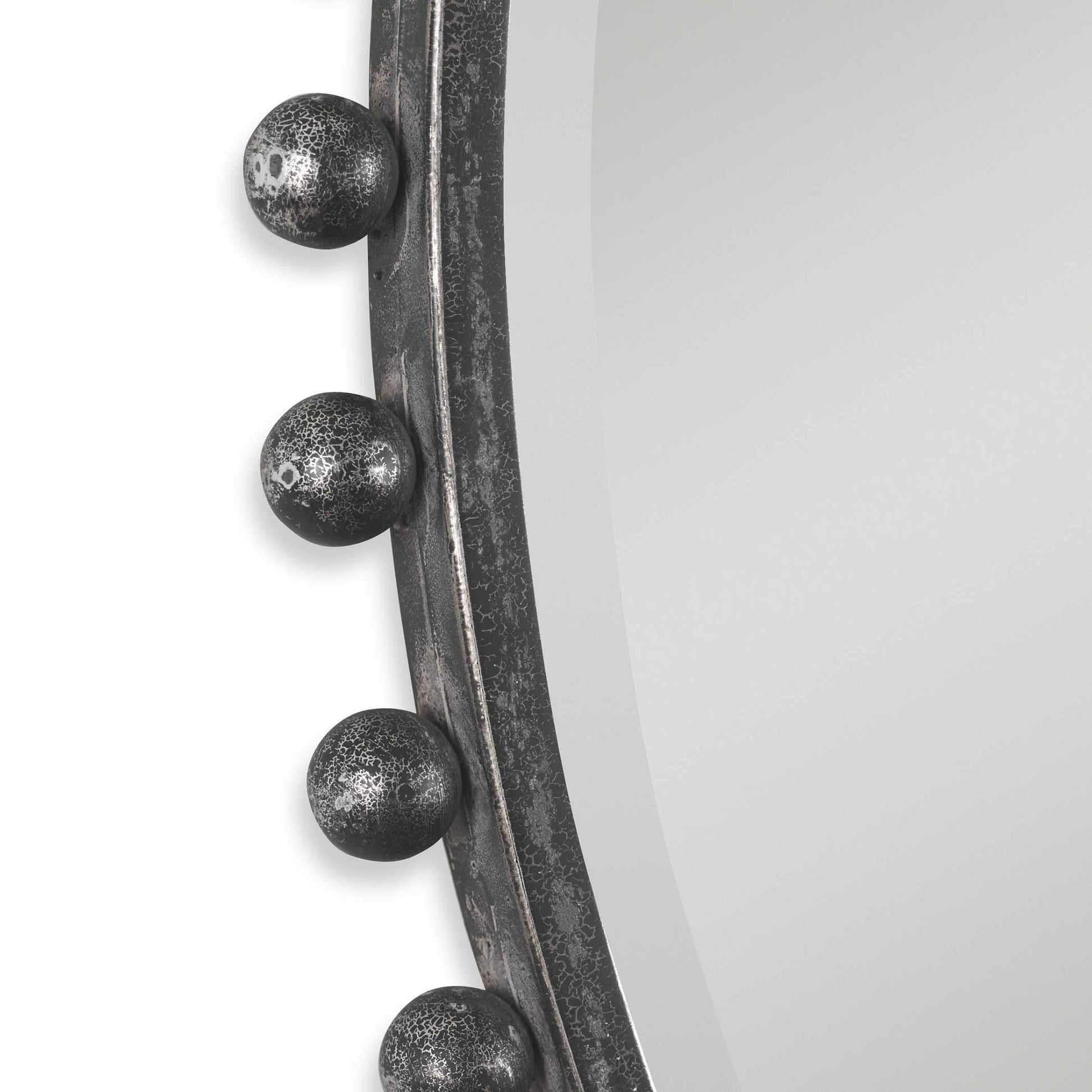 Le miroir Taza présente un cadre original orné de petites sphères en fer vieilli avec une finition noire et argentée.