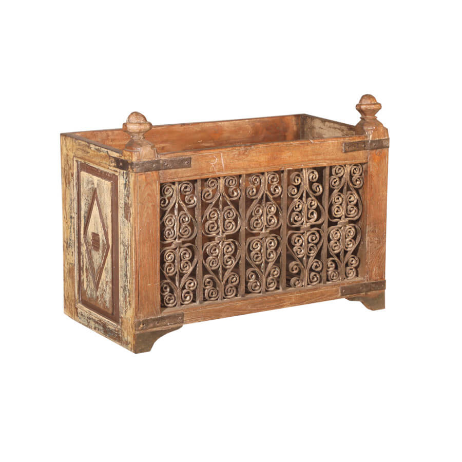 Ce pot de fleurs en teck est une véritable œuvre d'art, où le détail compte. Fabriqué en magnifique bois de teck aux marques d'usure et à la patine uniques, doté d'un panneau avant en fer soudé et de côtés finement sculptés, ce pot de fleurs est une pièce d'exception, fruit d'un savoir-faire artisanal.