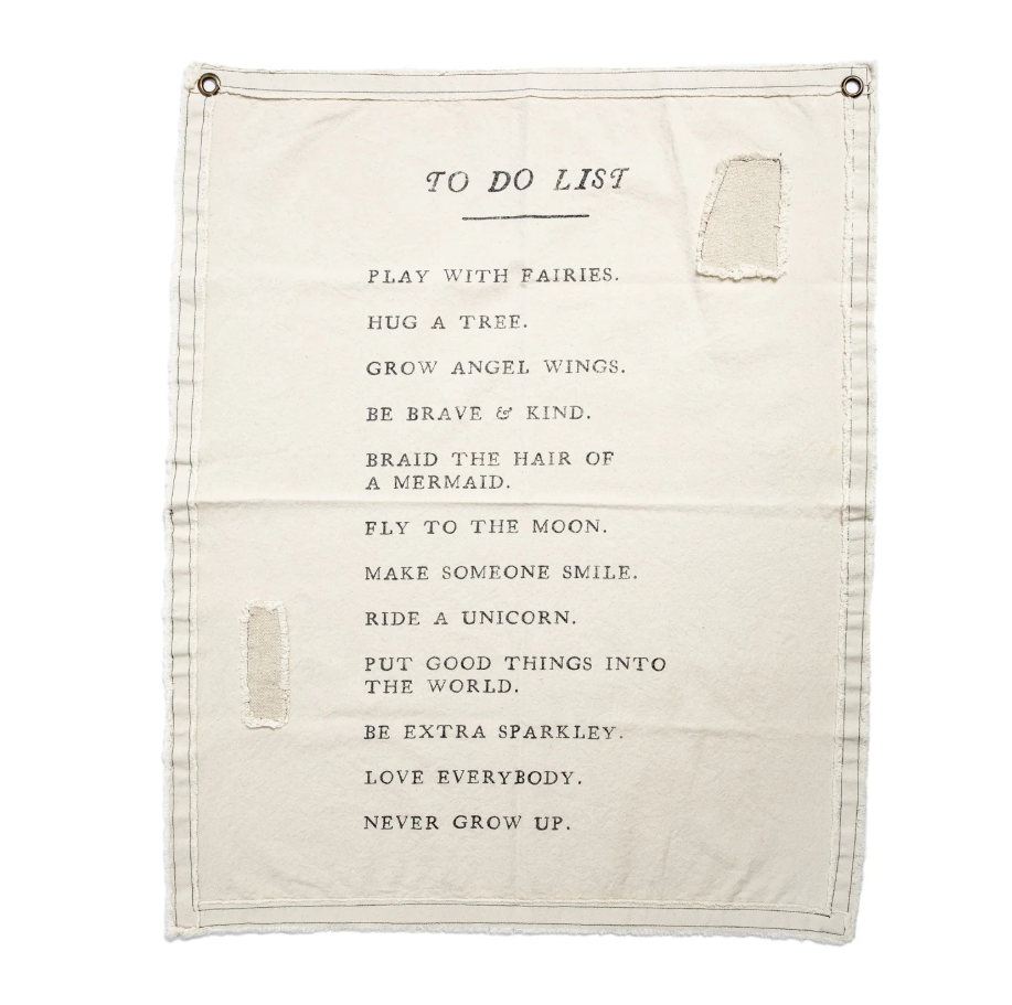 Cette tenture murale arbore un message inspirant de l'auteur Dodinsky, ce qui en fait un élément décoratif élégant et significatif pour votre intérieur. Les citations sont imprimées à la main directement sur la toile, avec des surpiqûres sur les côtés, ainsi que des empiècements cousus à la main et des bords effilochés pour un effet vieilli.