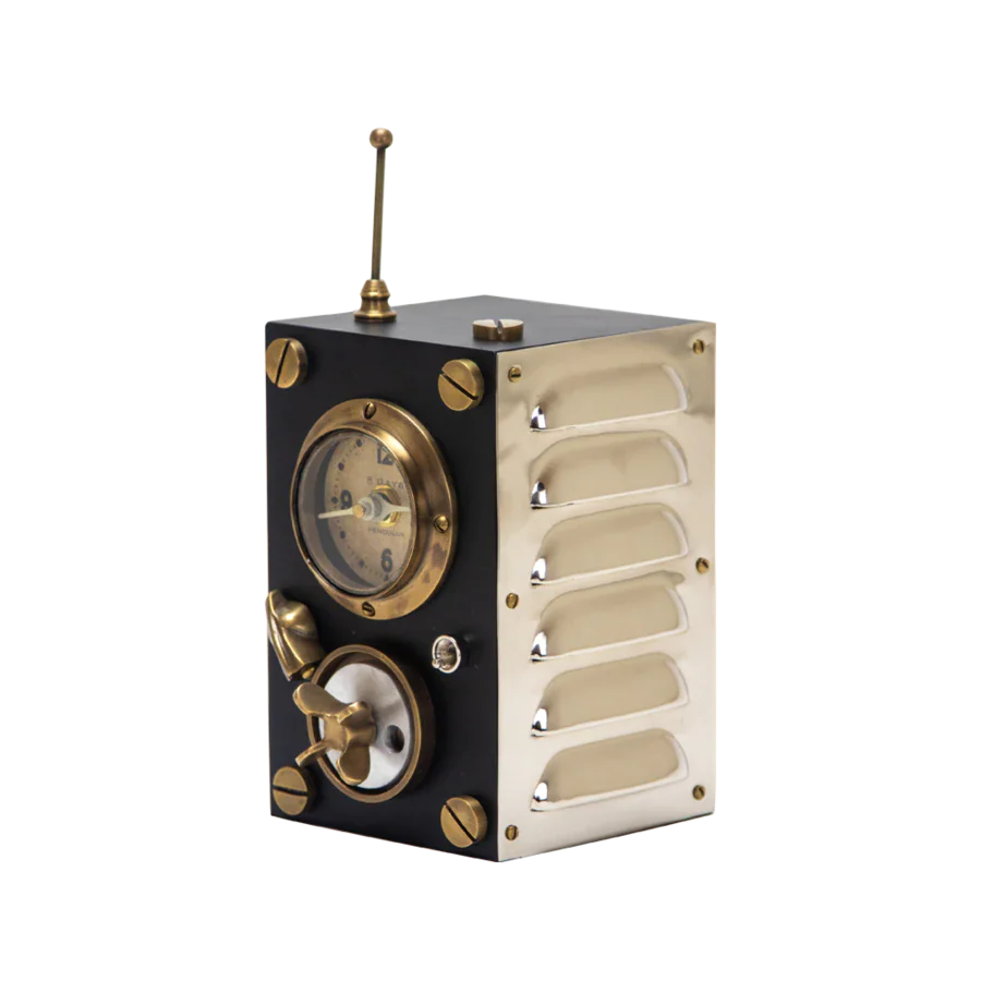 Fabriquée artisanalement en bois, aluminium et laiton, cette horloge de table unique s'inspire des émetteurs radio du début du XXe siècle. Outre ses boutons décoratifs, ses aérations latérales et ses rivets, elle abrite une horloge à quartz de haute précision.