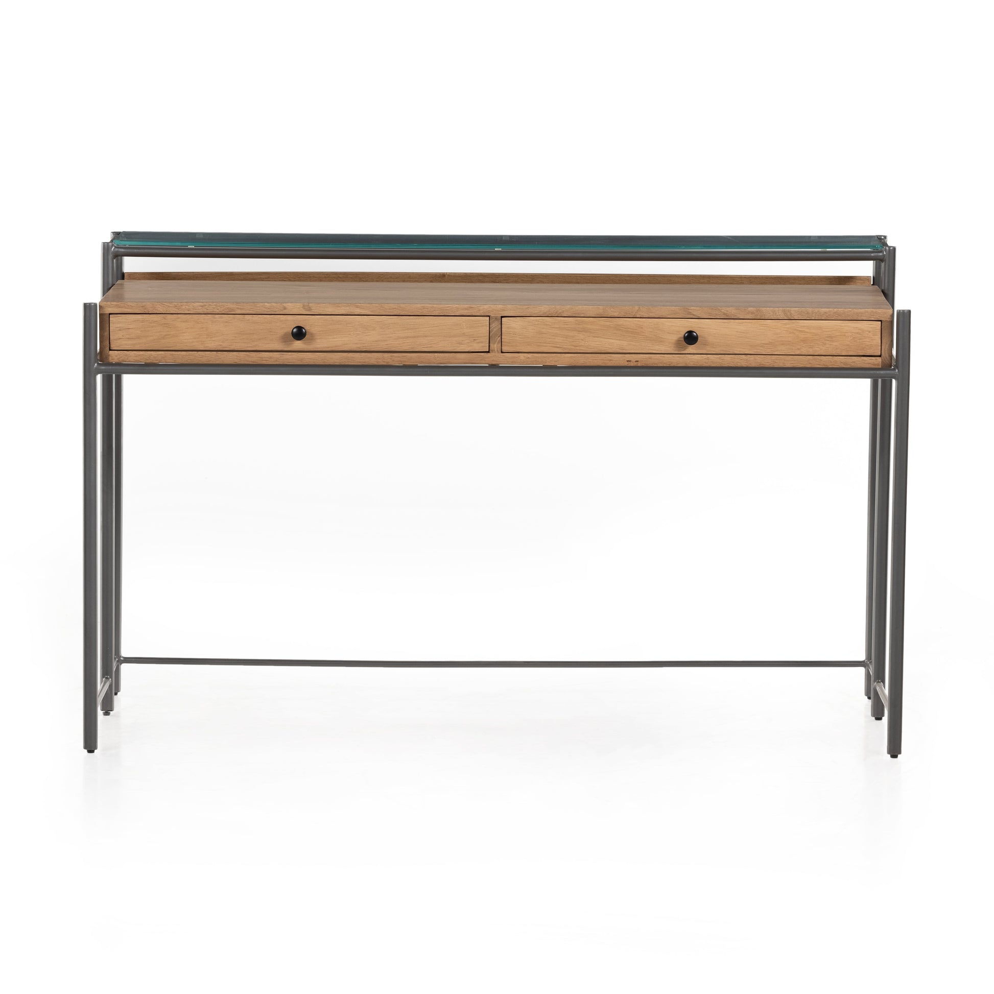 Avec un profil élégant et fin, le fer finition canon de fusil forme un cadre aéré et épuré pour un bureau en bois d'hévéa massif finition miel fumé, avec deux tiroirs pour un rangement pratique et des étagères en verre trempé pour un espace de rangement et d'exposition supplémentaire.