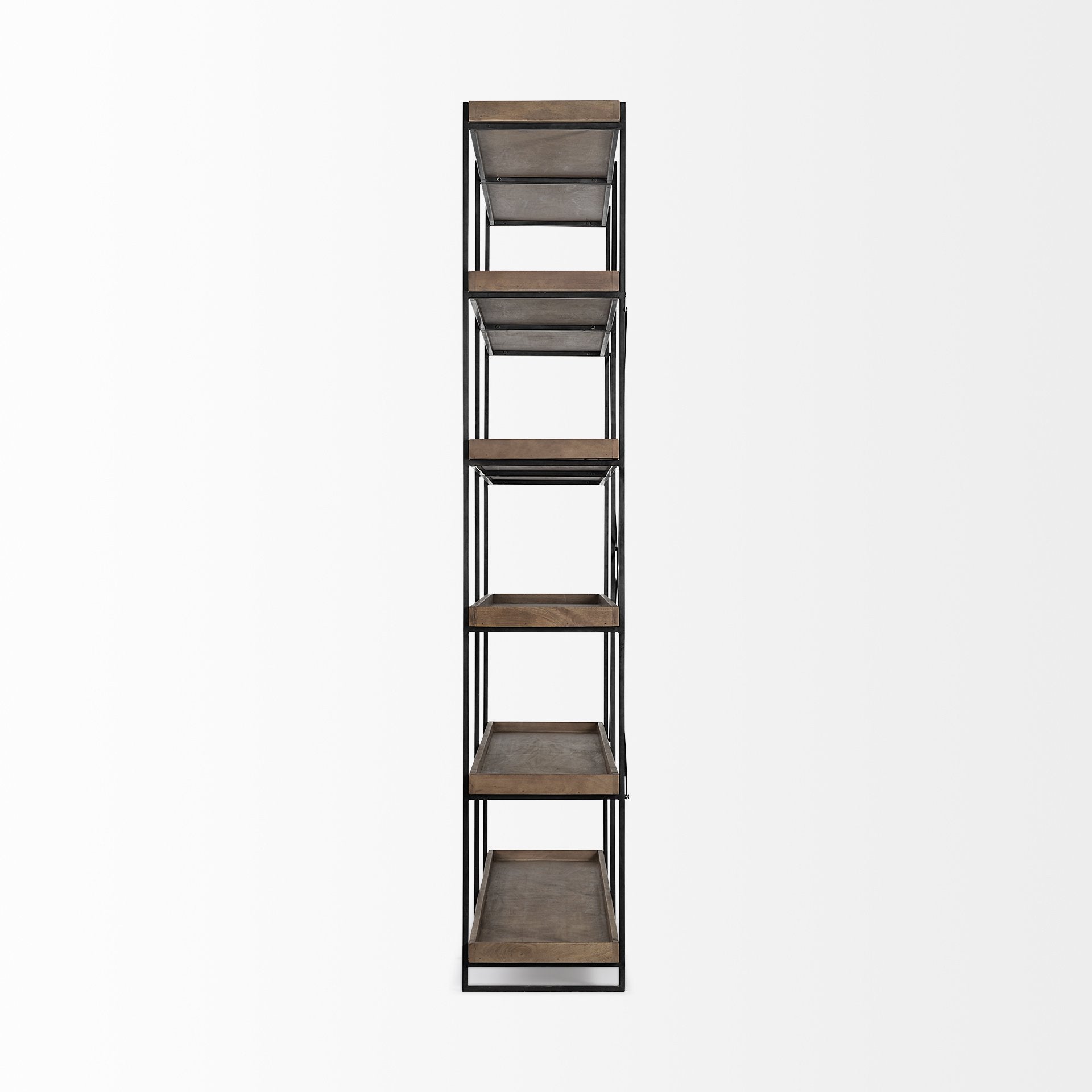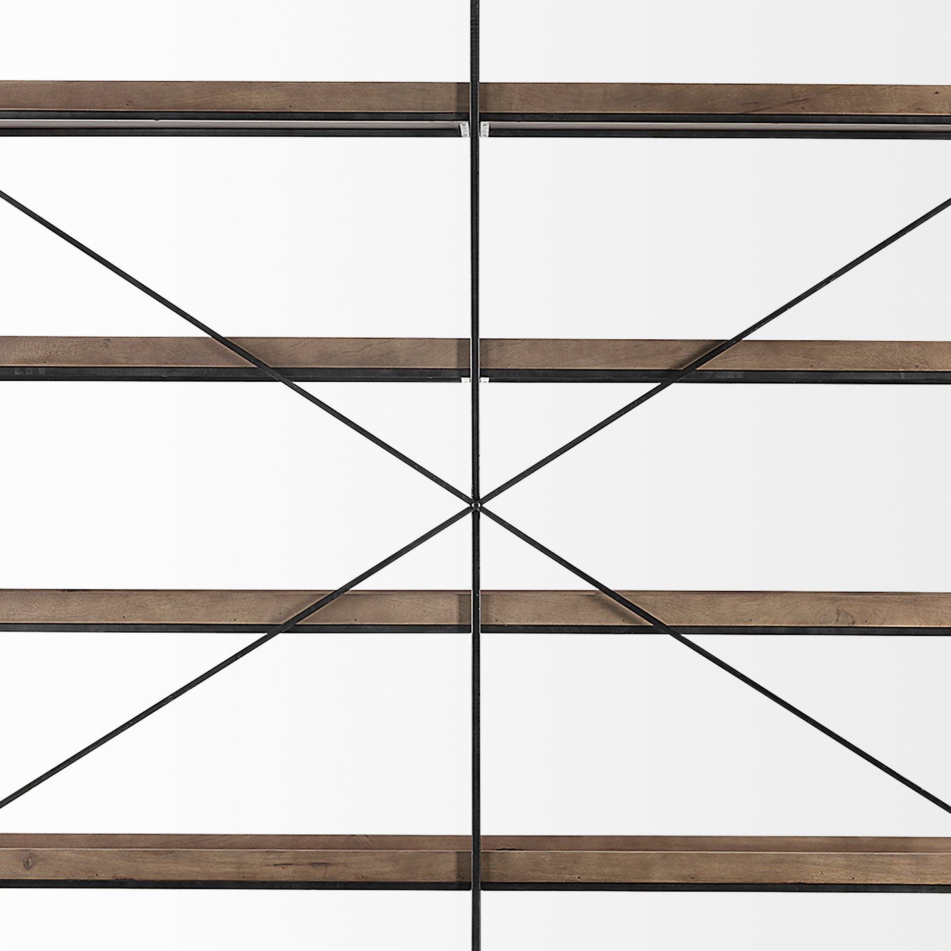 Les étagères en bois sont empilées verticalement et soutenues par un cadre en fer massif de couleur noir mat qui non seulement stabilise l'unité à la perfection, mais ajoute également au visuel de cette pièce.