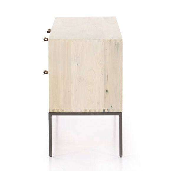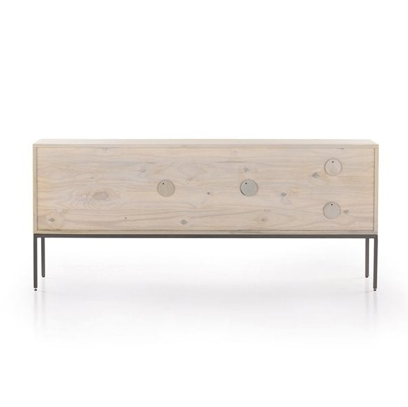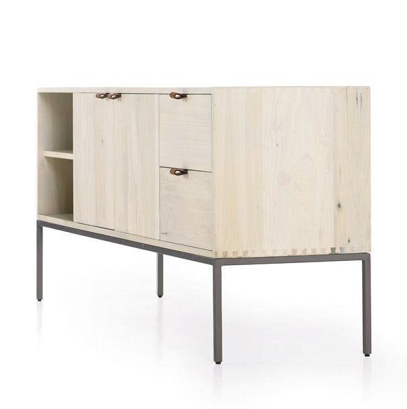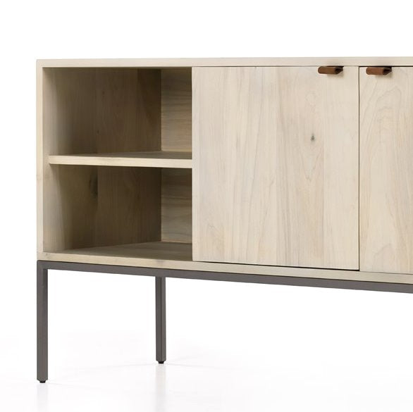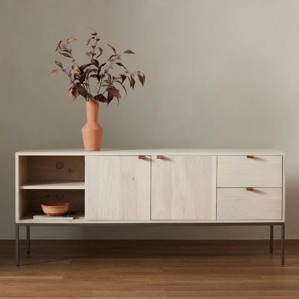 Inspiré du design épuré du milieu du siècle, le meuble TV Trey offre de nombreux rangements, un grand espace de rangement, des étagères ouvertes et deux tiroirs. Ses poignées en cuir pleine fleur, fixées par du métal, apportent une touche d'originalité et de texture.