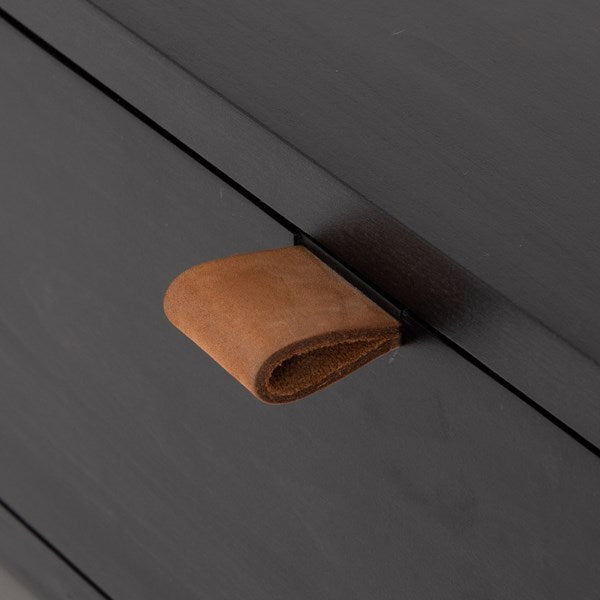La table de chevet Trey présente un design épuré et moderne, fabriqué en fer robuste et en peuplier massif. Elle offre un grand espace de rangement et des poignées en cuir fixées par du métal qui ajoutent une touche d'originalité et de texture.