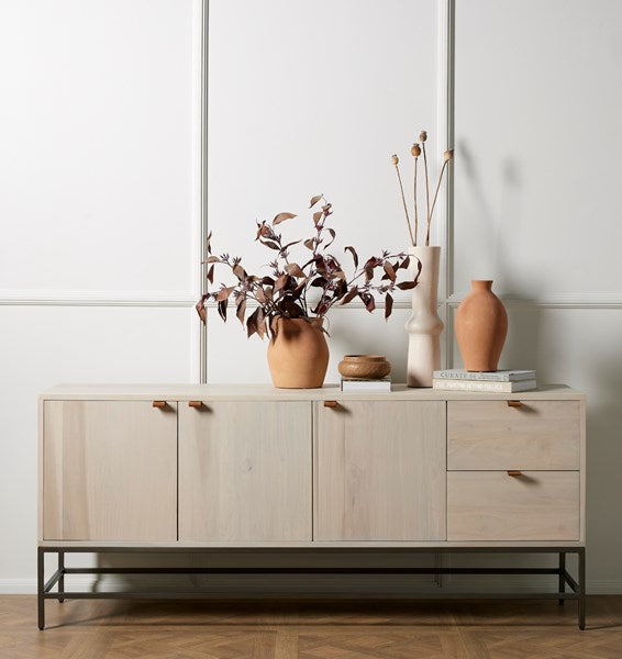 Inspiré du design épuré du milieu du siècle, ce buffet élégant en peuplier massif offre un grand espace de rangement grâce à ses vastes placards et ses deux tiroirs. Des poignées en cuir pleine fleur, fixées par du métal, apportent une touche de texture originale. Disponible en peuplier gris clair, peuplier roux moyen et peuplier noir.