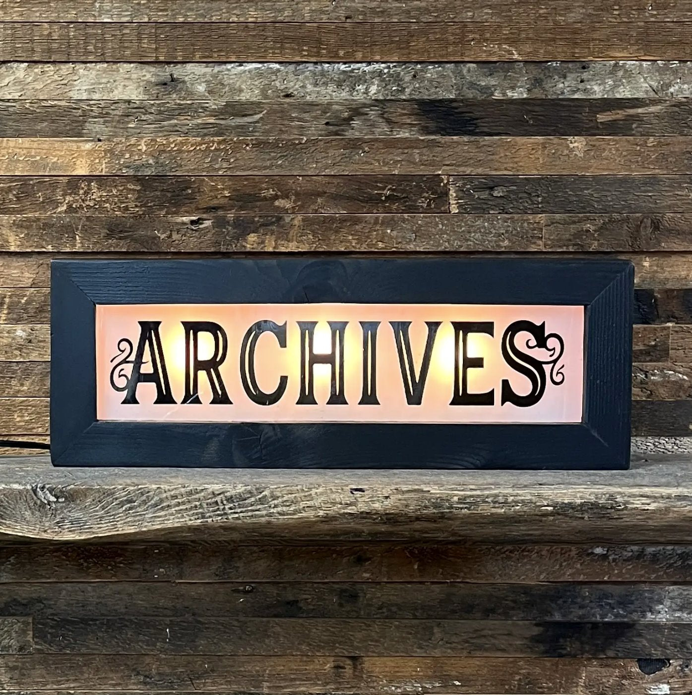 Archives : Curly Que Font et cadre en bois de cèdre avec une finition noire et du verre ondulé/bullé.