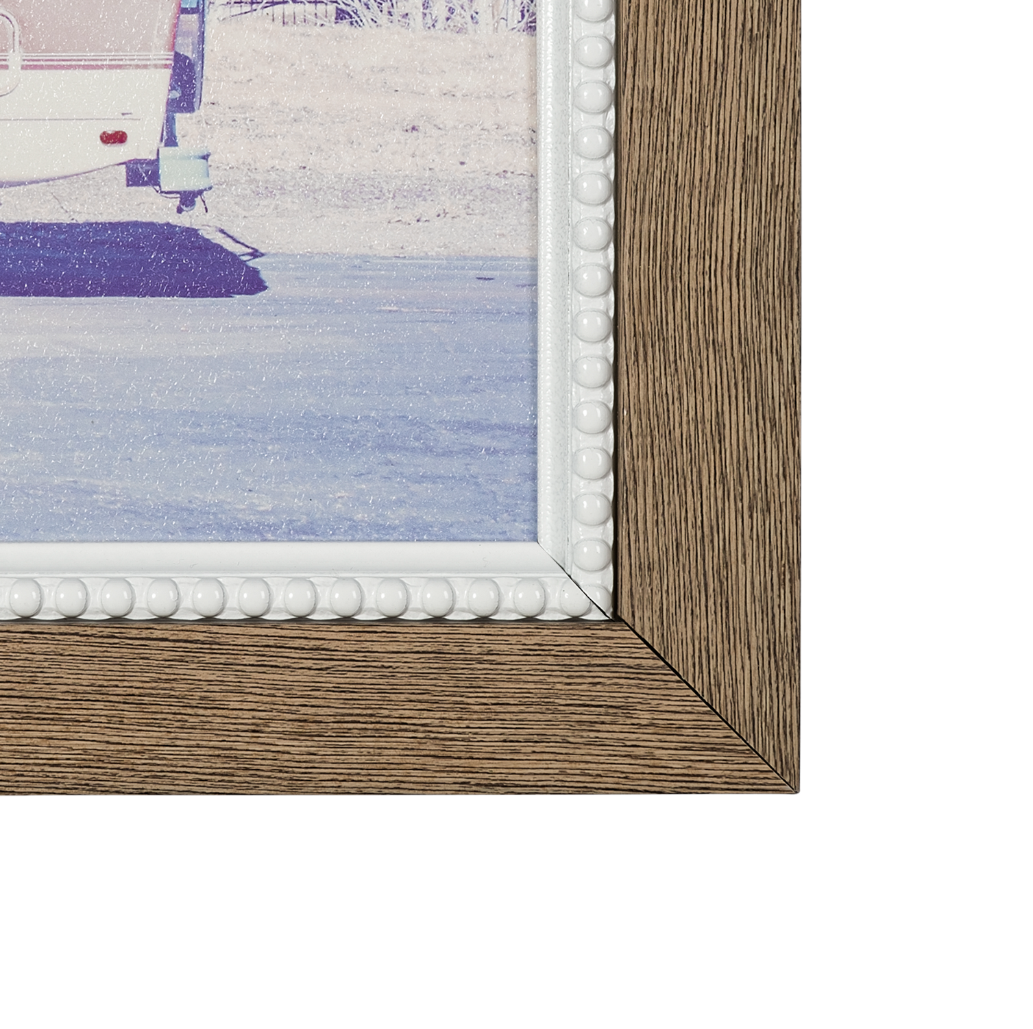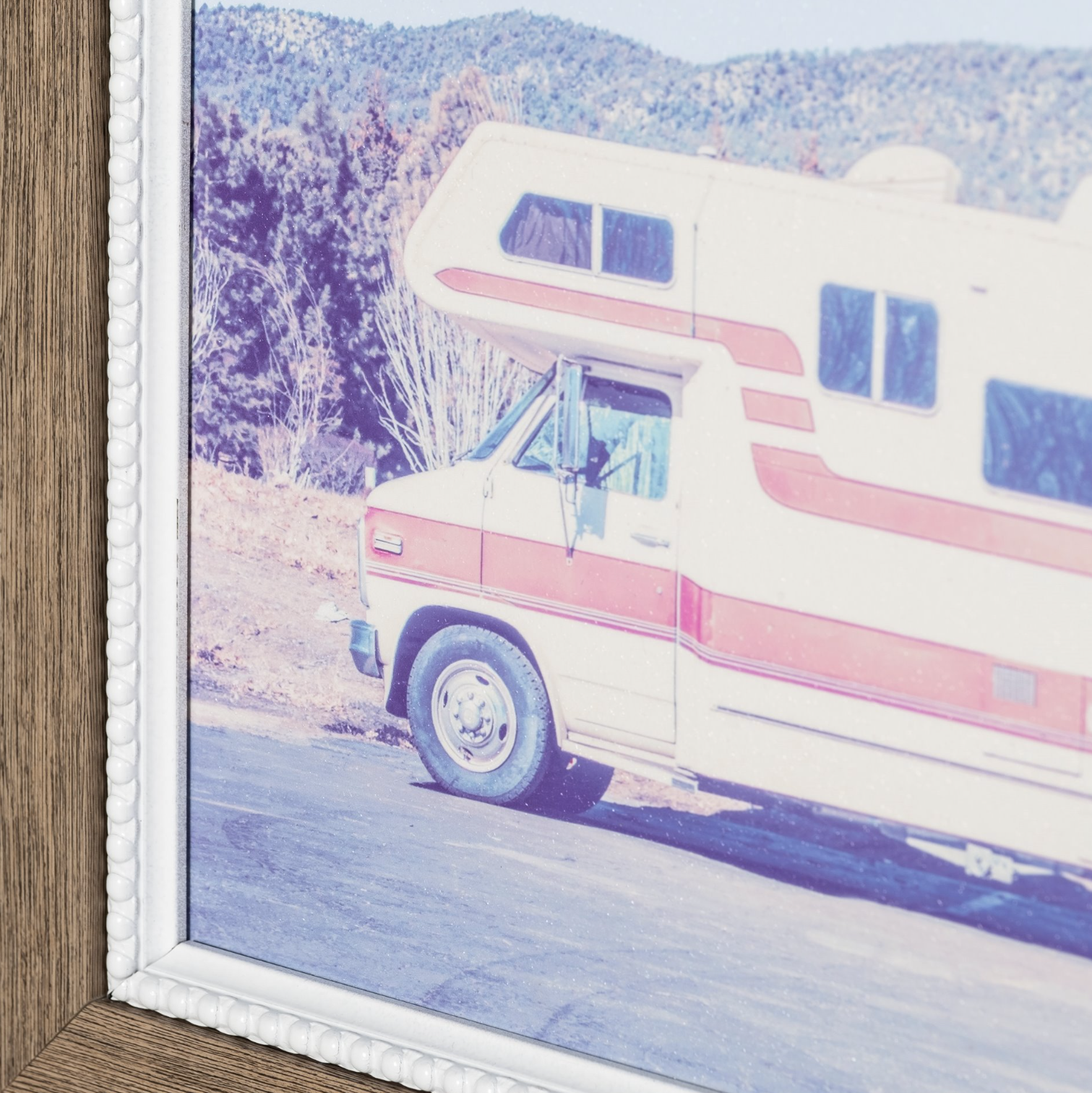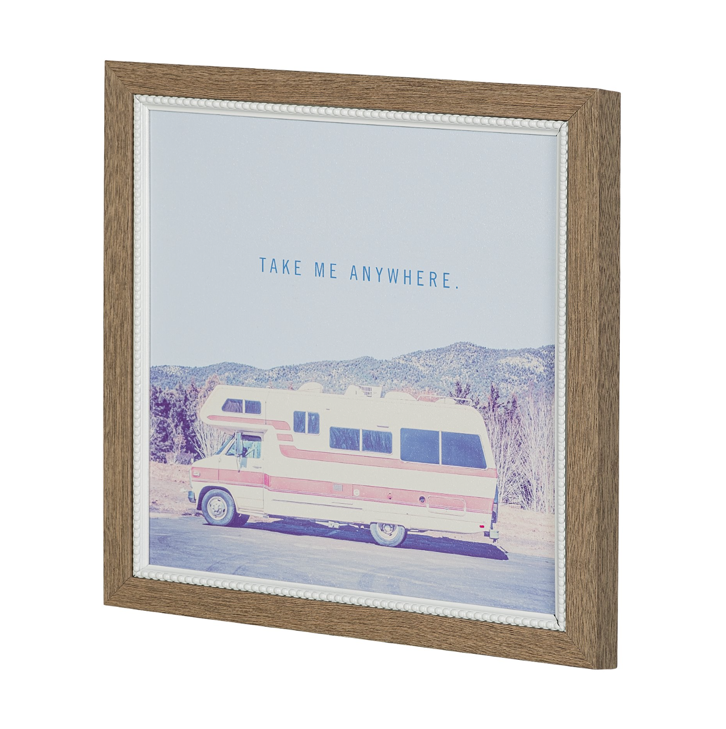 Une photo d'inspiration vintage, rehaussée à la main, représentant un camping-car dans un paysage désertique, avec l'inscription « Emmène-moi n'importe où ». Le tirage est encadré d'un cadre brun aux moulures blanches, une superbe image à ajouter à votre galerie murale.