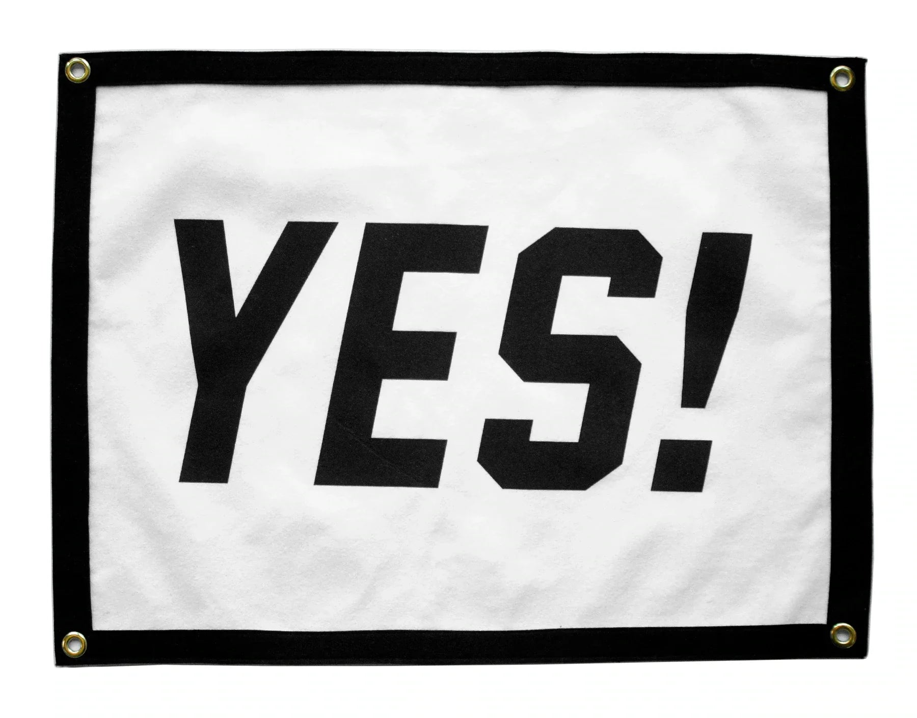 Affichez votre optimisme avec ce drapeau de camp. Ce drapeau arbore un texte noir sportif sur fond blanc, bordé de noir. Confectionné en feutre de laine de haute qualité.